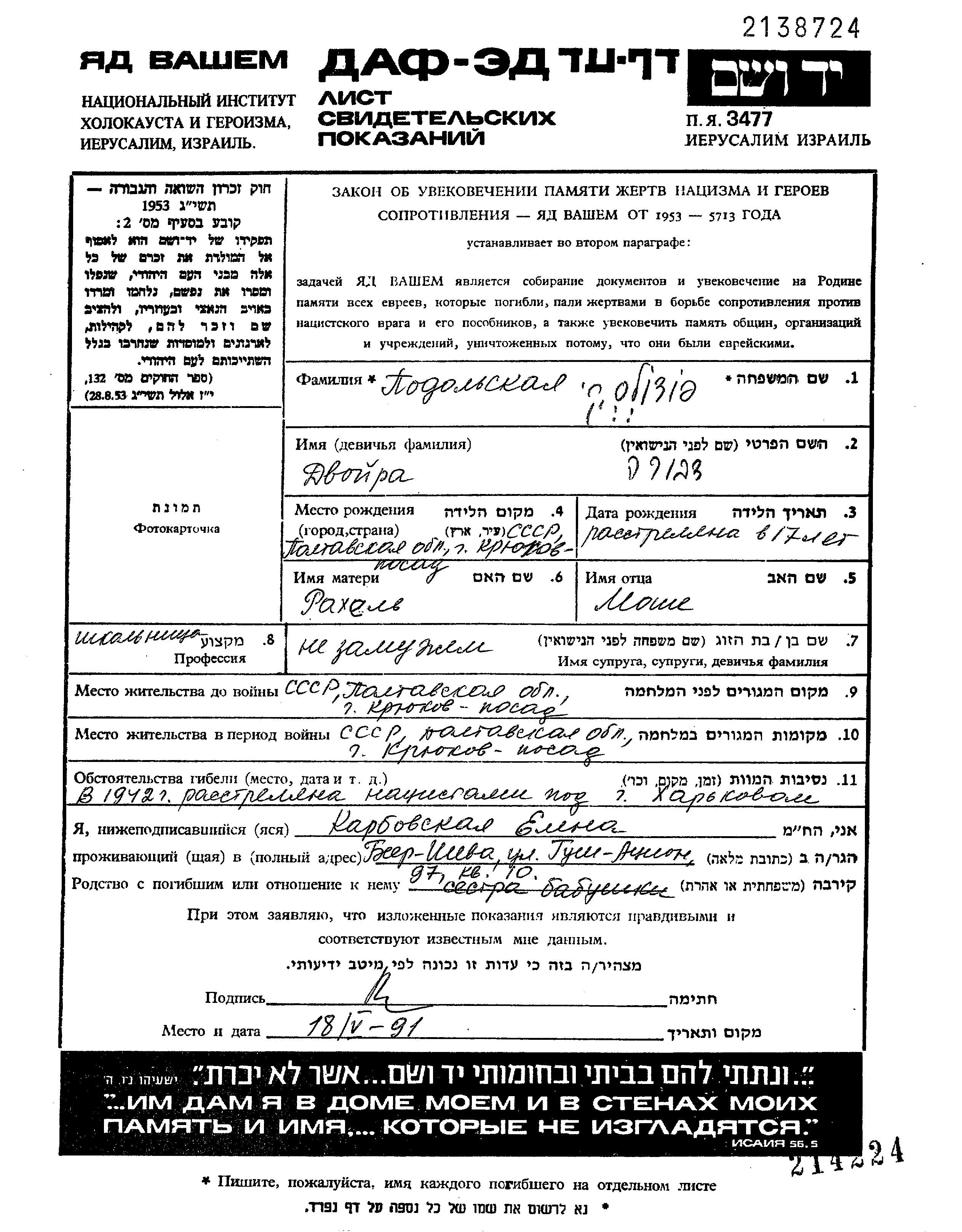 Подольски Двойра Крюков, Украина (СССР) Лист свидетельских показаний