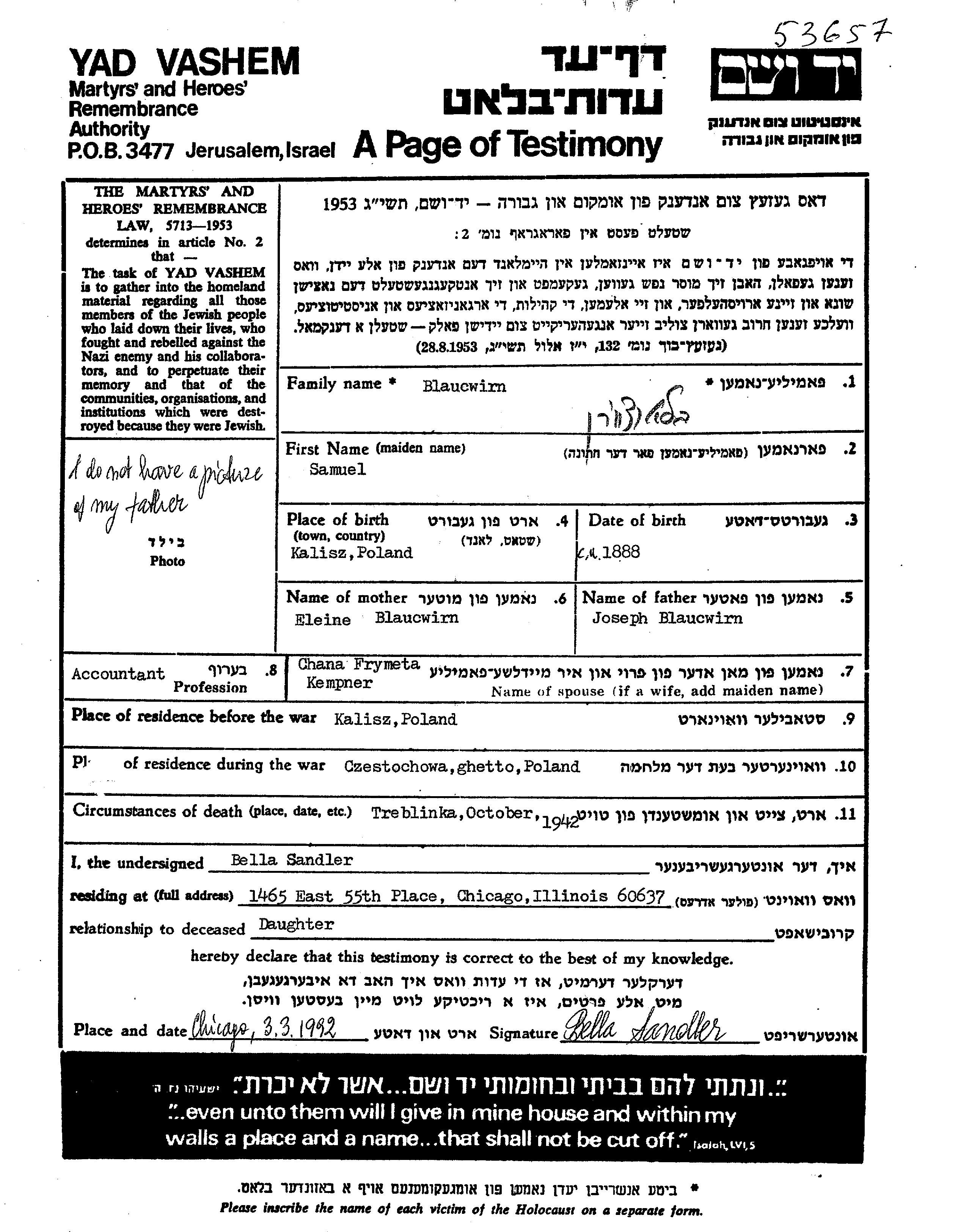 Самуэль Блауцвирн, место рождения: Калиш, Польша. Отец: Йосеф, mать:Элейн. Бухгалтер / счетовод. Женат / замужем. Место жительства до войны: Калиш, Польша. Место во время войны: Ченстохова, Польша.