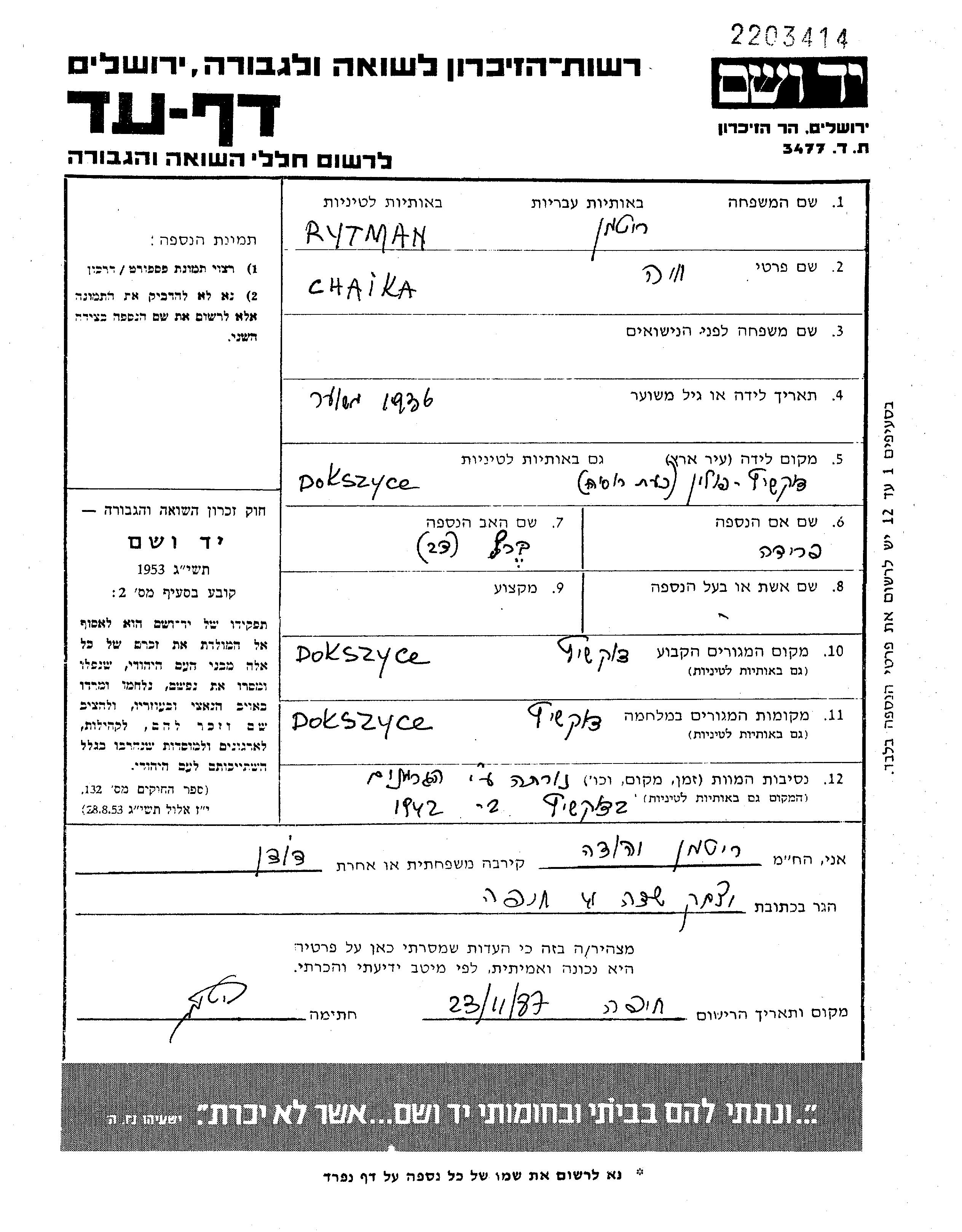 Рытман Хайка 1936 Докшицы, Польша Лист свидетельских показаний