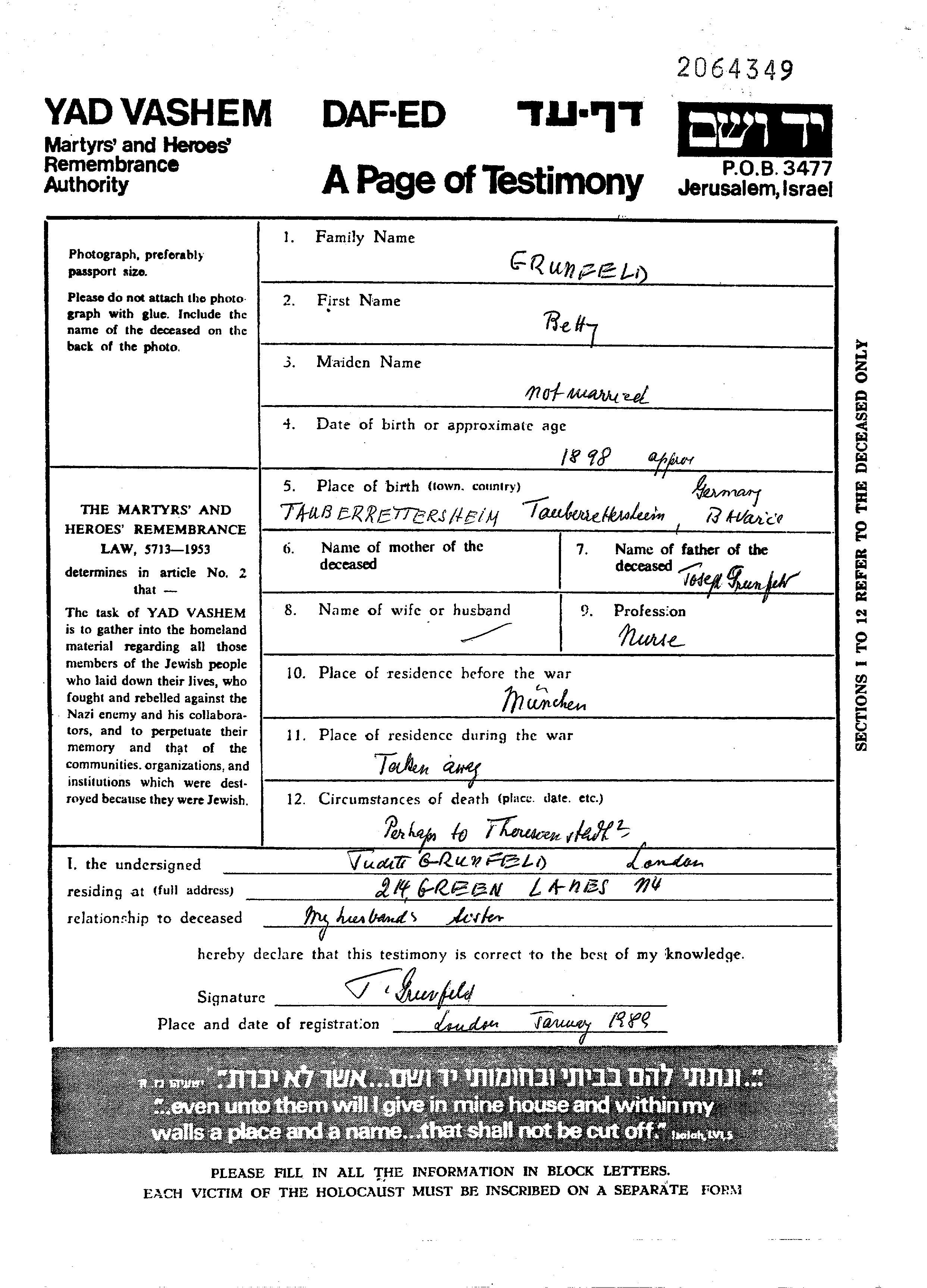 Бетти Грунфельд, место рождения: Тауберреттерсхейм, Германия. Отец: Йосеф. Медбрат / медсестра. Холост / не замужем. Место жительства до войны: Мюнхен, Германия. Место во время войны: Мюнхен, Германия.