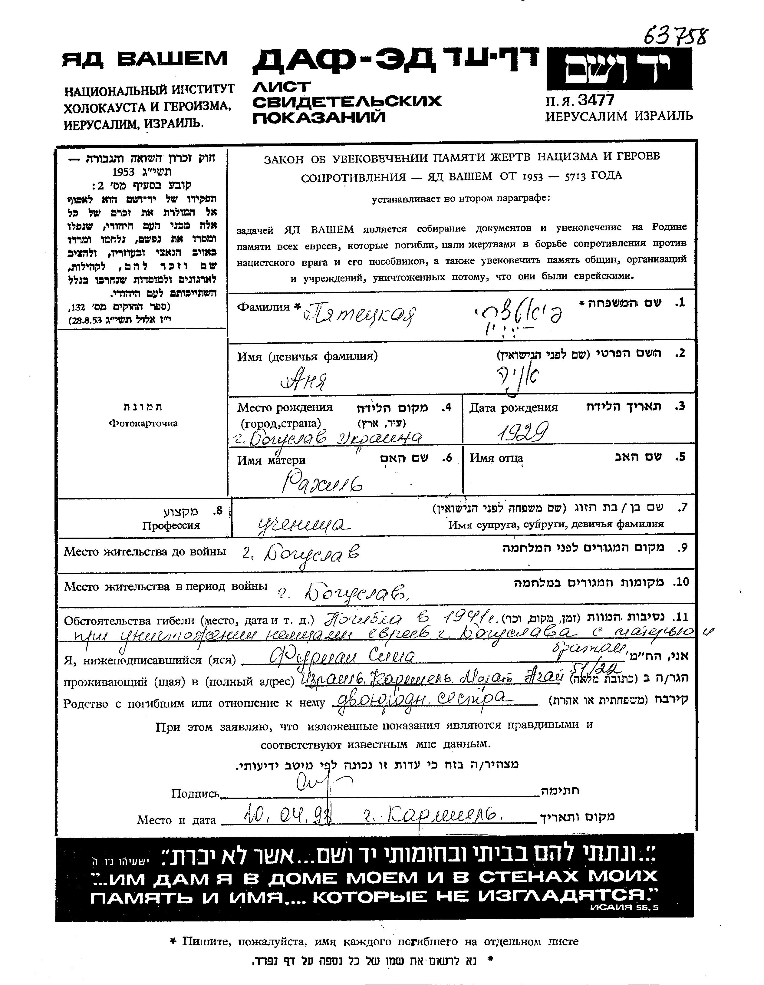 Пятецкая Аня 1929 Богуслав, Украина (СССР) Лист свидетельских показаний