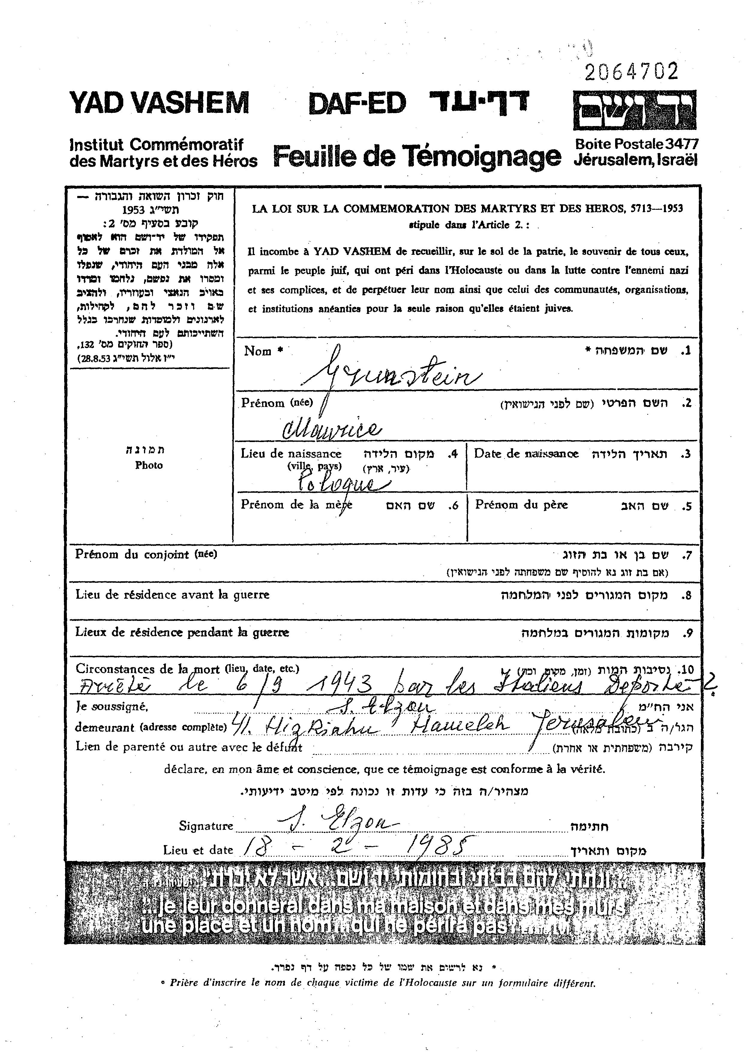 Грунштайн Морис место не указано, Лист свидетельских показаний