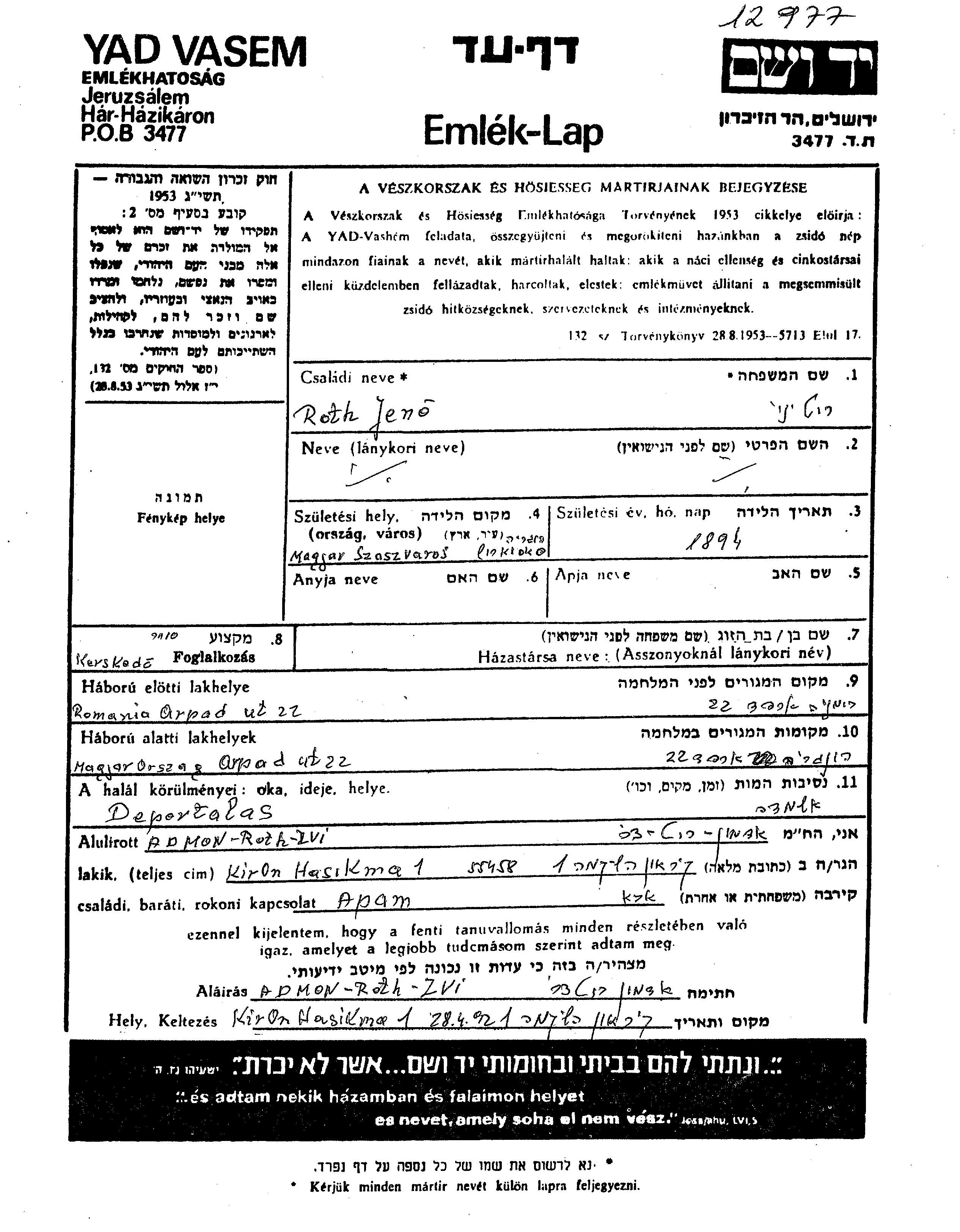 Рот Рут Ено 1894 Коложвар, Румыния Лист свидетельских показаний