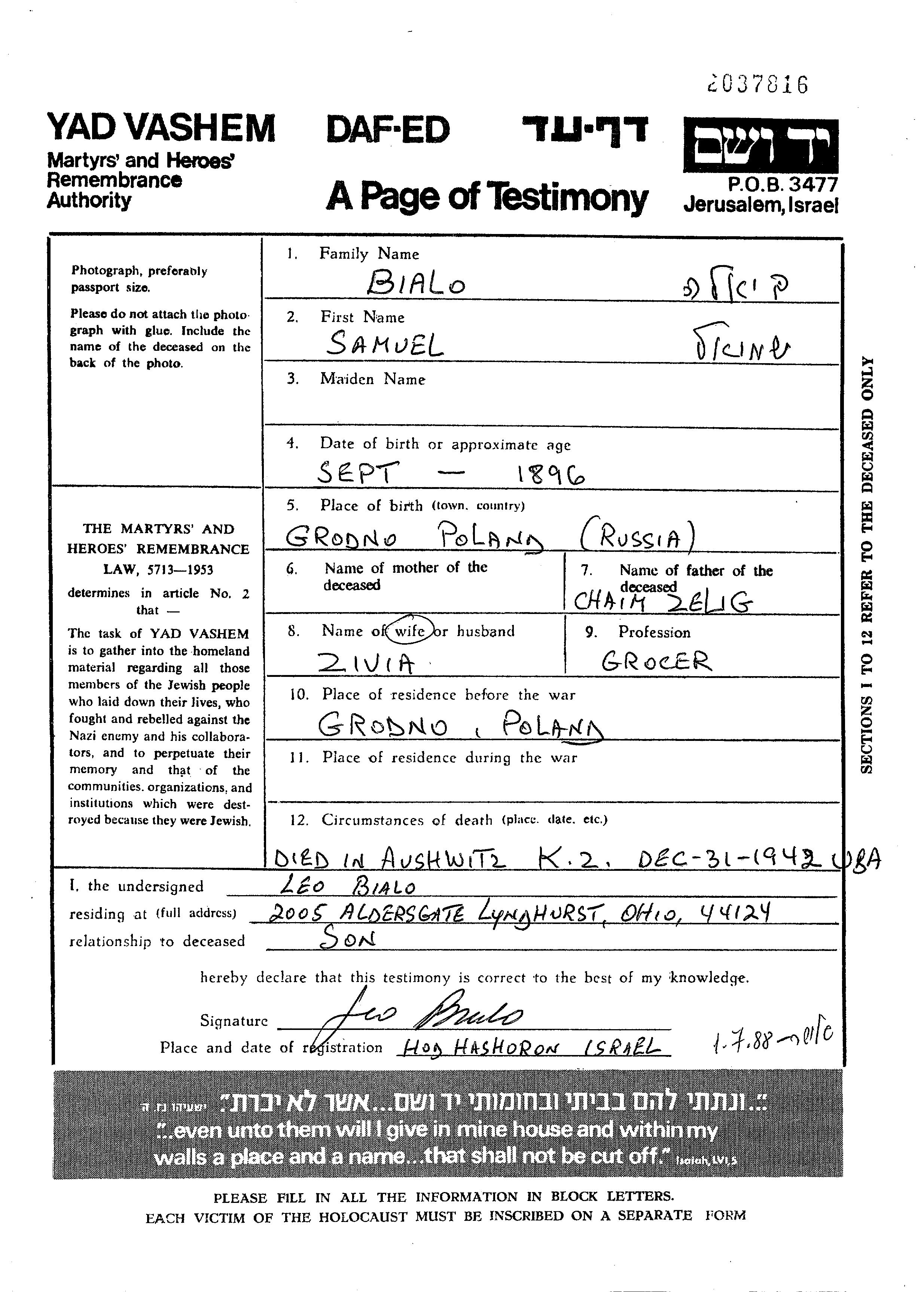 Шмуэль Бяло Бяле, место рождения: Гродно, Польша. Отец: Хаим Зелик. Владелец / владелица продуктового магазина. Женат / замужем. Место жительства до войны: Гродно, Польша.