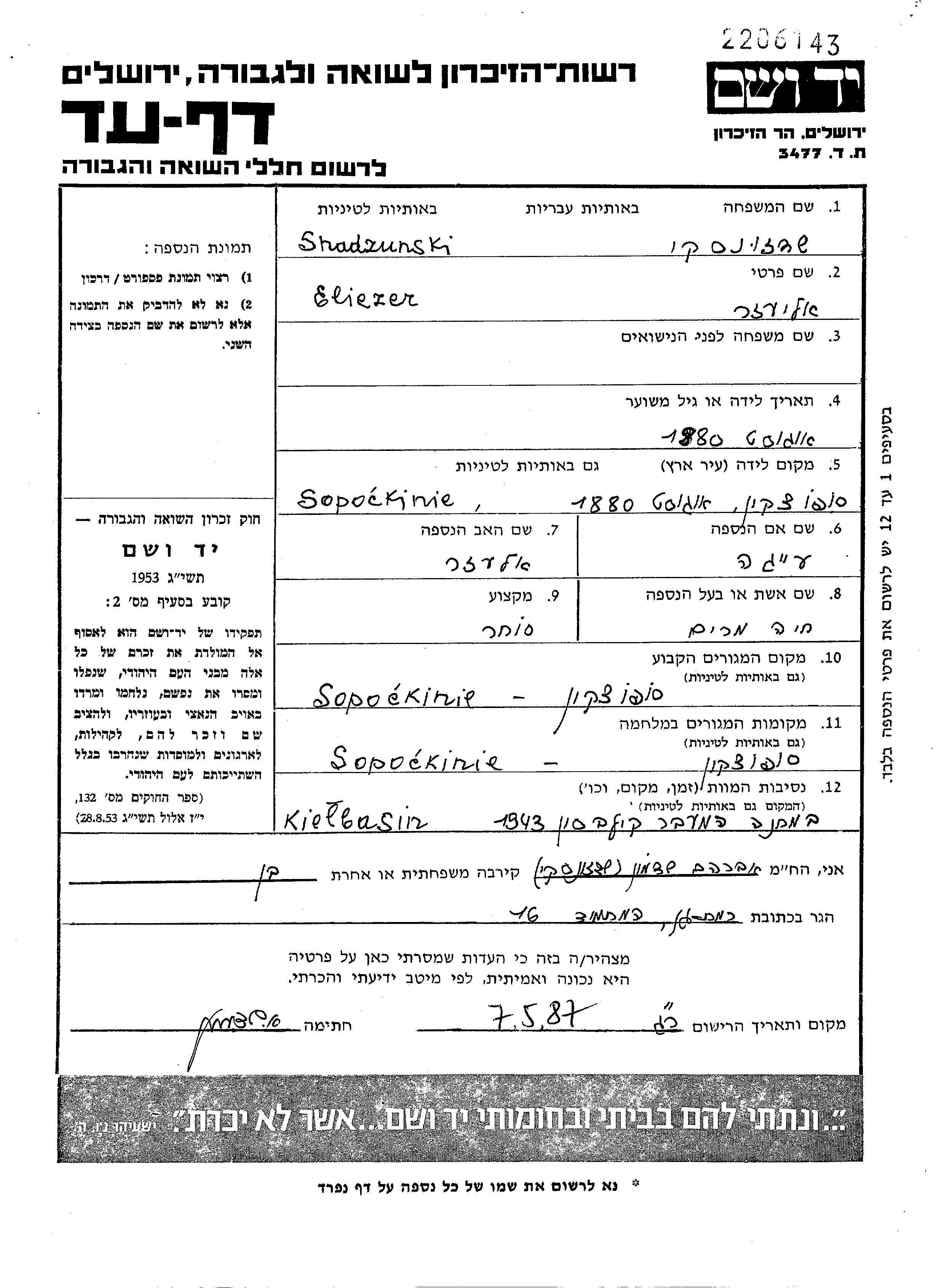 Шадзунски Элиэзер 1880 Сопоцкин, Польша Лист свидетельских показаний