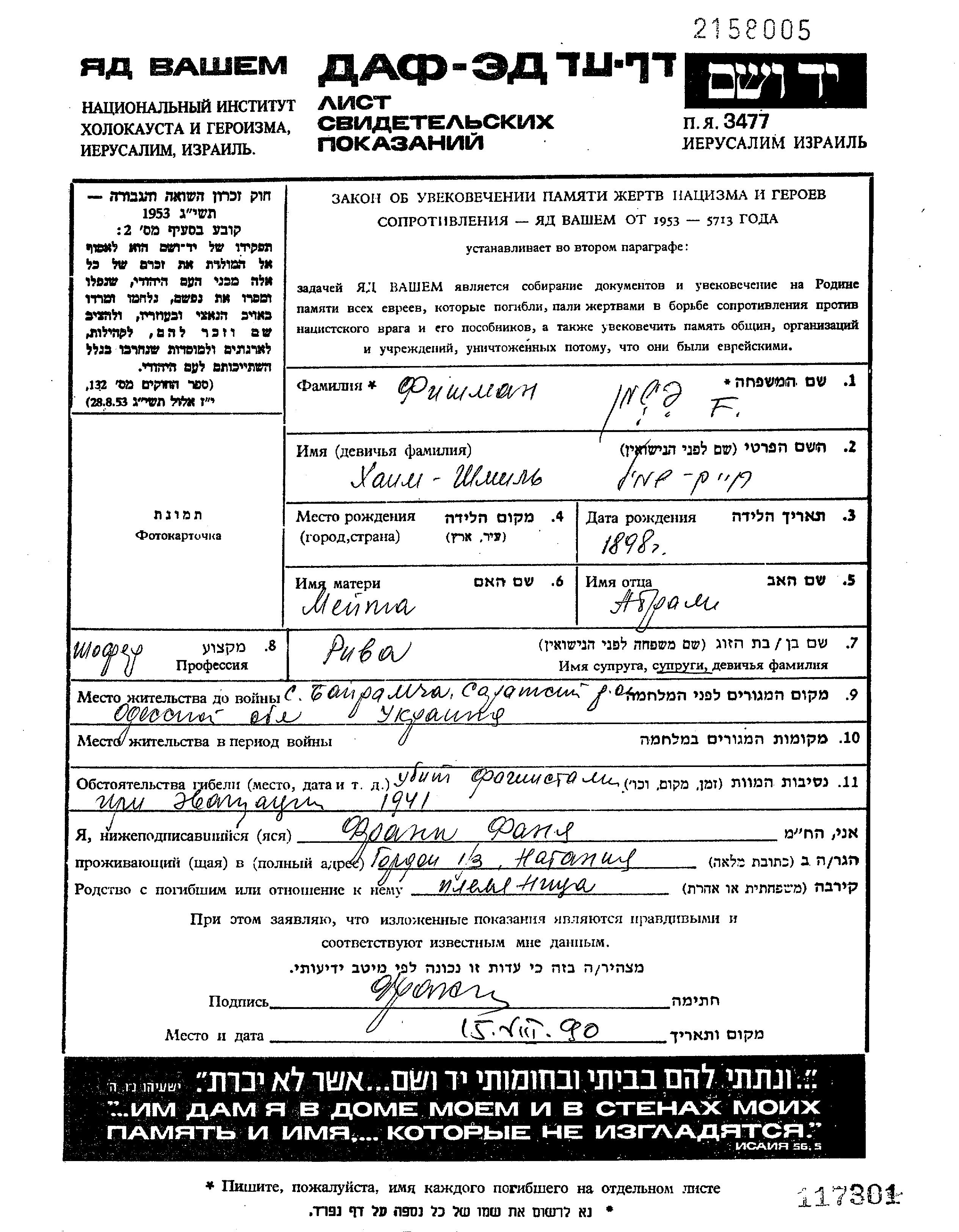Фишман Шмиль Хаим 1898 Байрамча, Румыния Лист свидетельских показаний