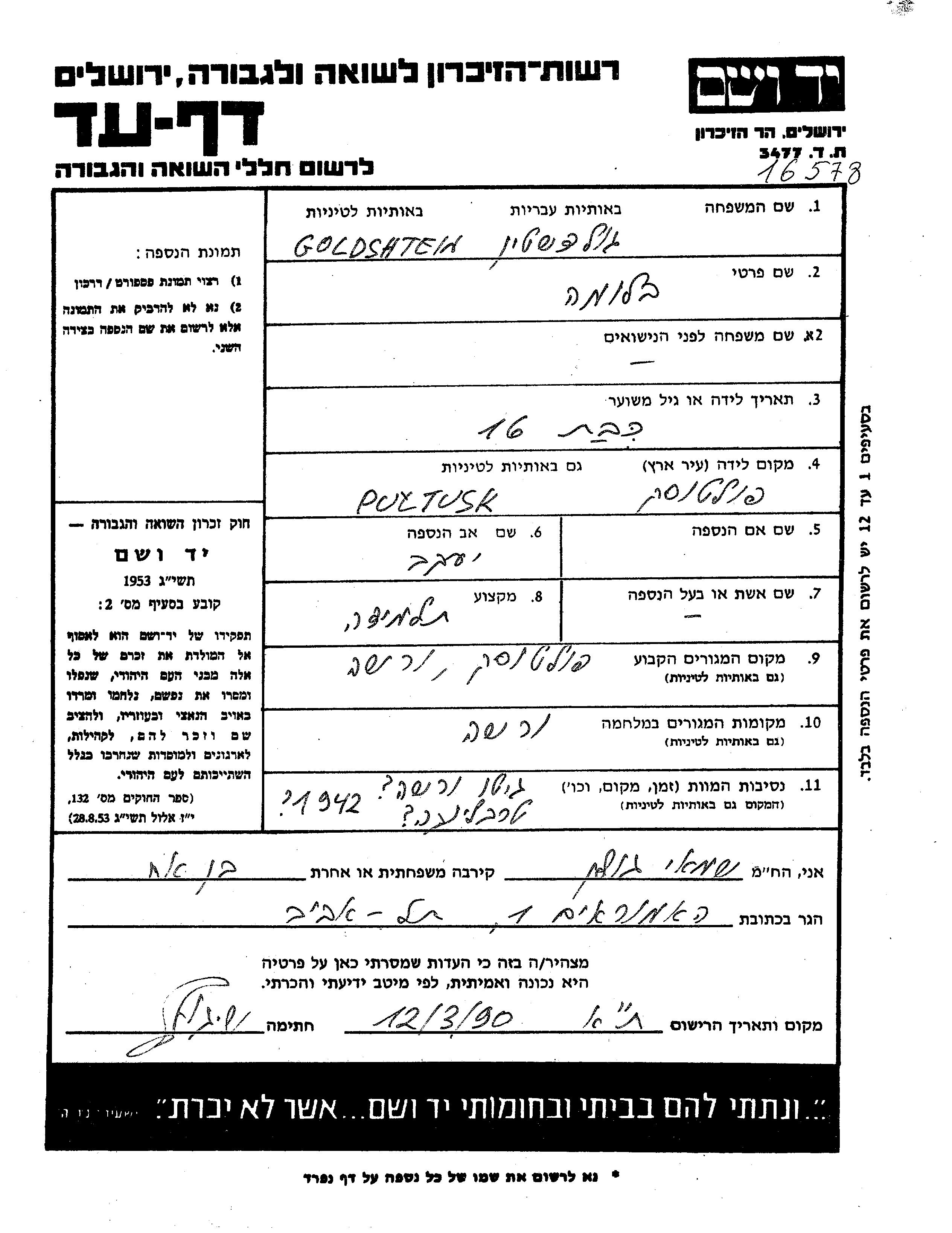 Гольдштейн Блюма 1926 Пултуск, Польша Лист свидетельских показаний