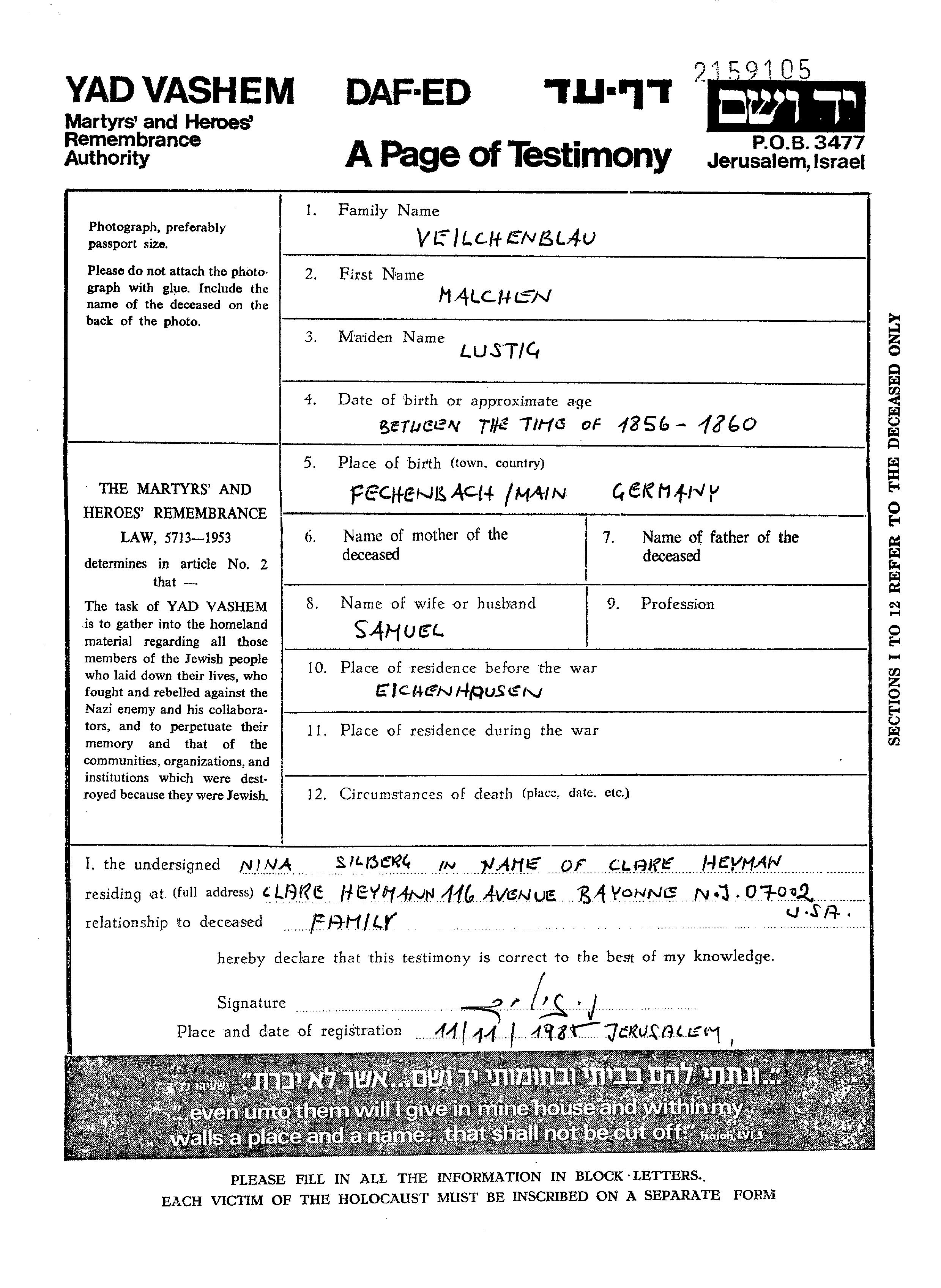 Мальхен Файльхенблау, девичья фамилия Люстиг, место рождения: Фехенбах, Германия. Женат / замужем. Место жительства до войны: Эйхенхаузен, Германия.