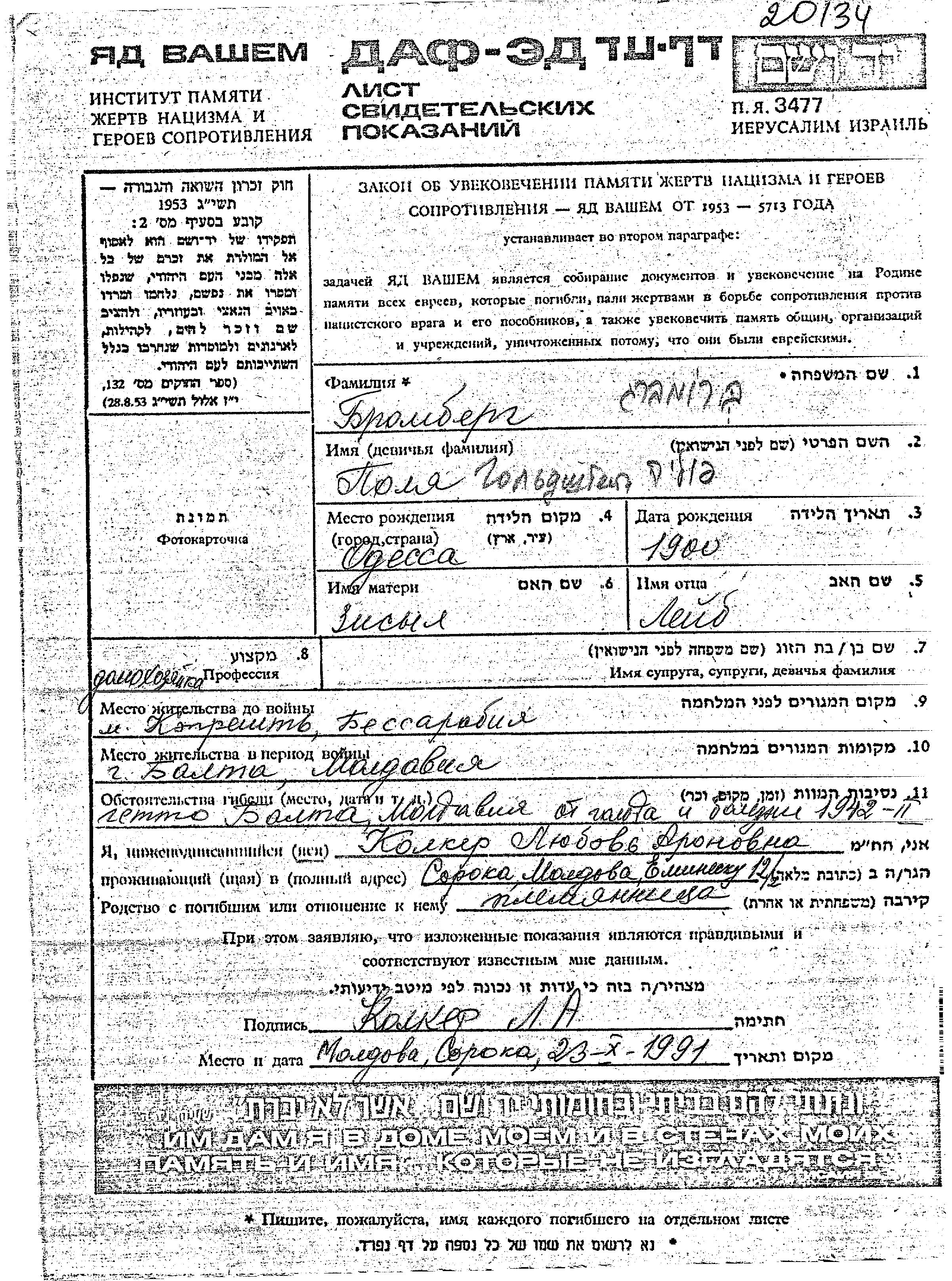 Поля Бромберг, девичья фамилия Гольдштейн, место рождения: Одесса, Украина (СССР). Отец: Лейб, mать:Зисел. Домохозяйка. Место жительства до войны: Капрешты, Румыния. Место во время войны: Балта, Украина (СССР).