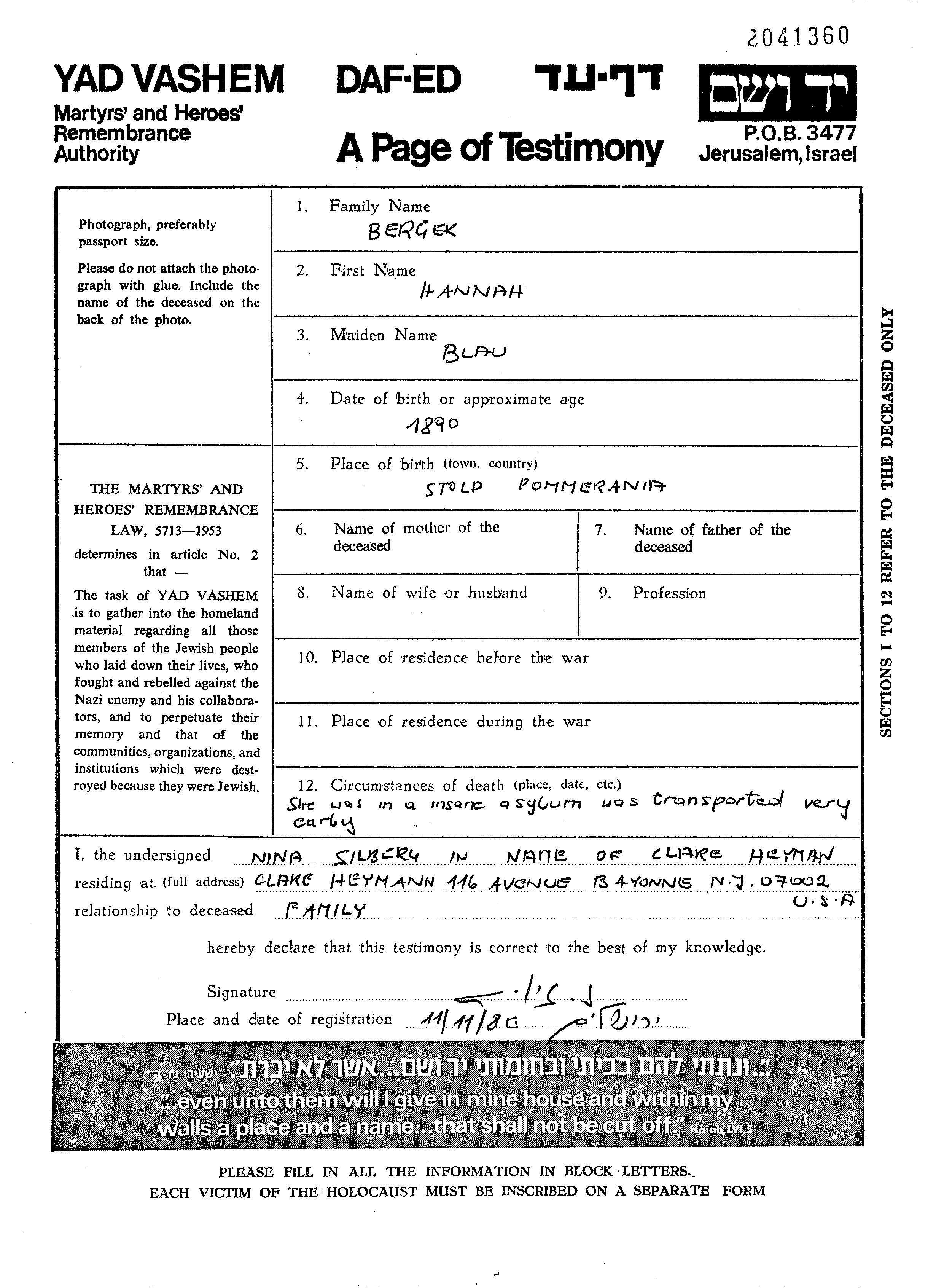 Бергер Ханна 1890 место не указано, Лист свидетельских показаний