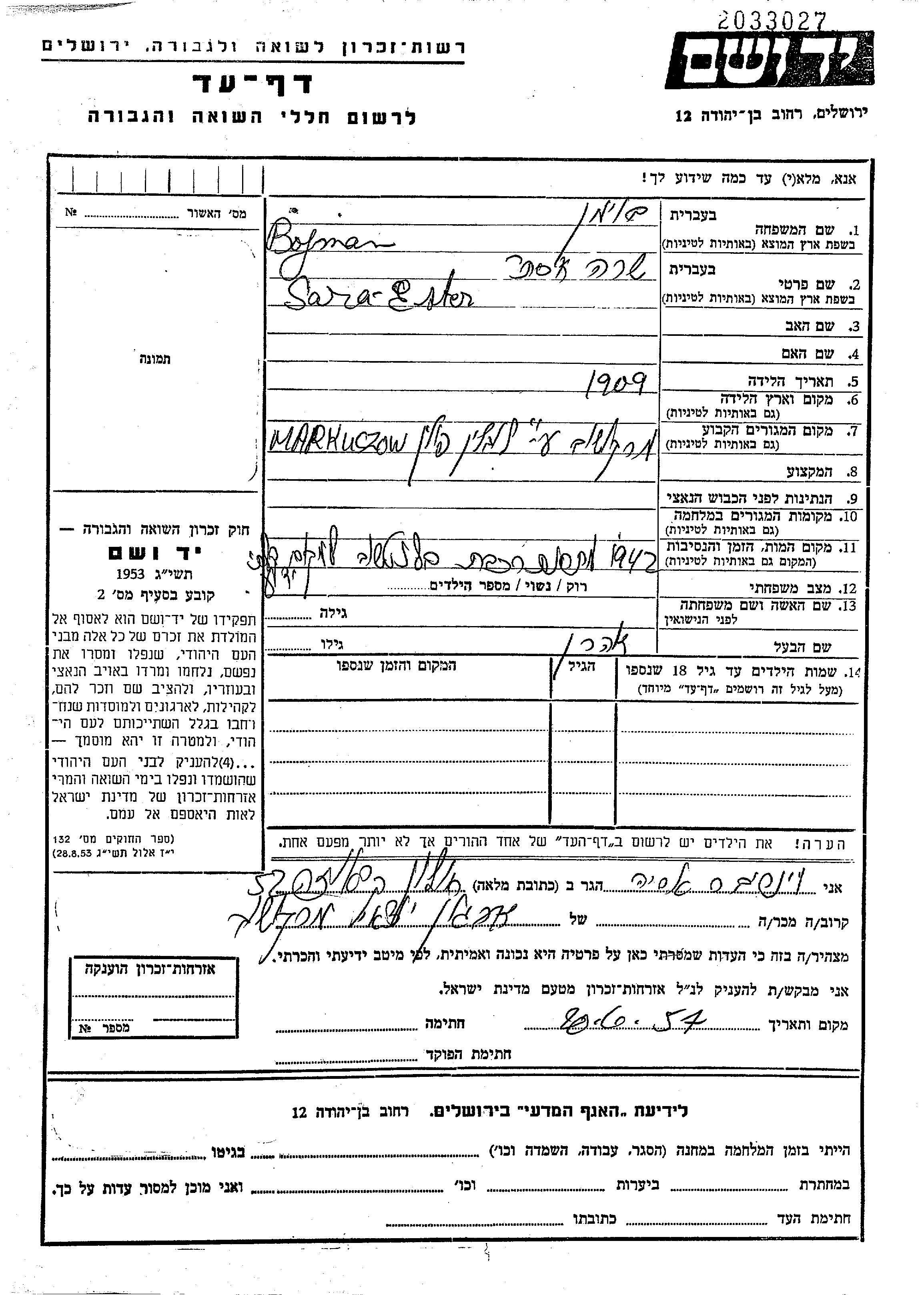 Сара Эстер Бойман, место рождения: Маркушув, Польша. Женат / замужем.