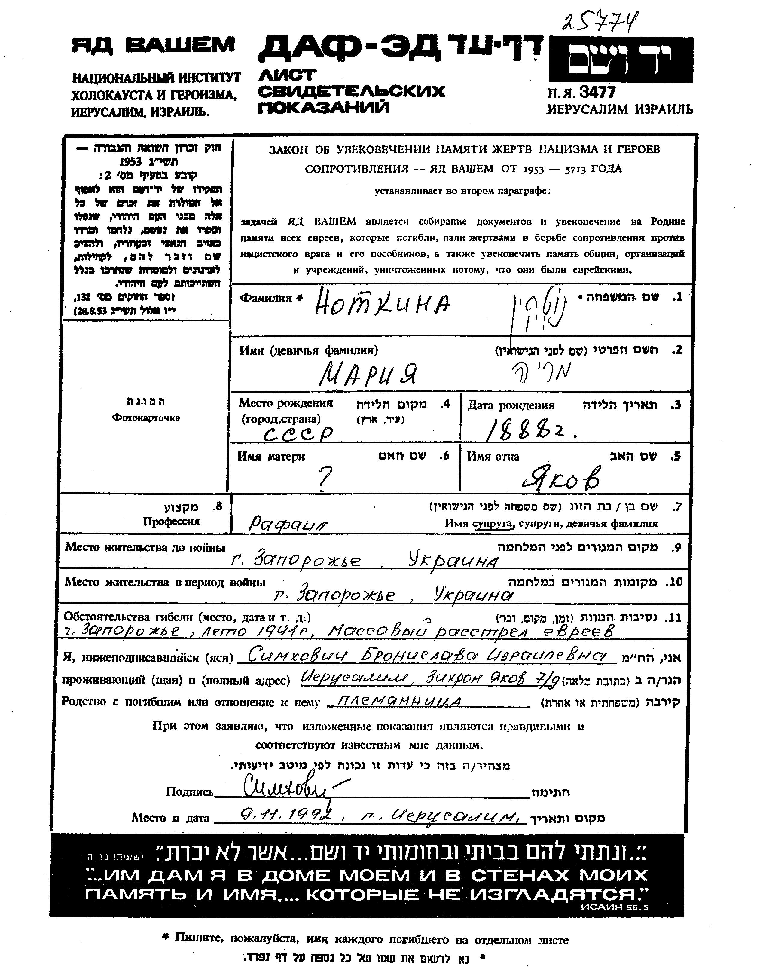 Ноткин Мария 1888 Запорожье, Украина (СССР) Лист свидетельских показаний
