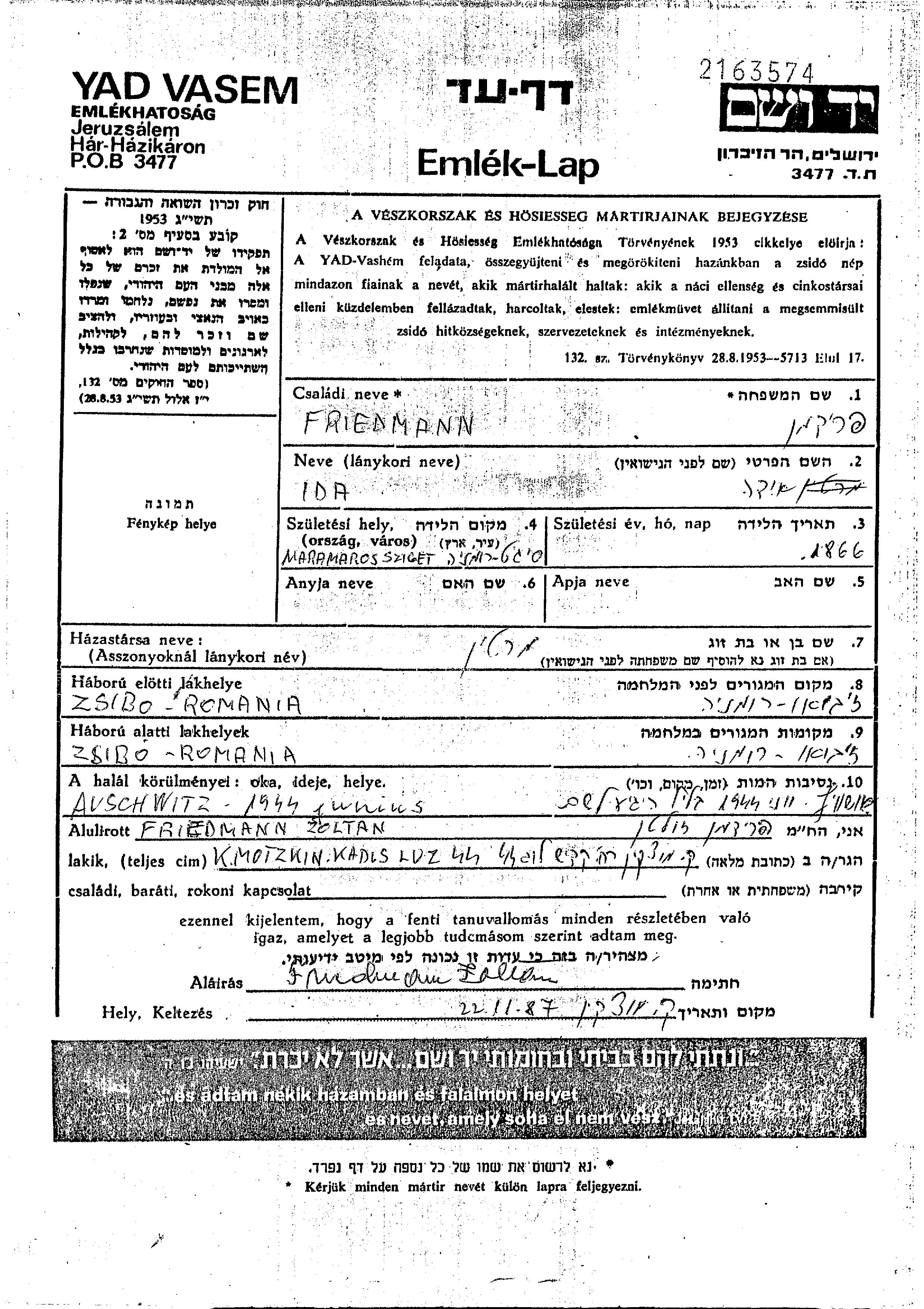 Ида Фридманн, место рождения: Марамарошсигет, Румыния. Женат / замужем. Место жительства до войны: Жибо, Румыния. Место во время войны: Жибо, Румыния.