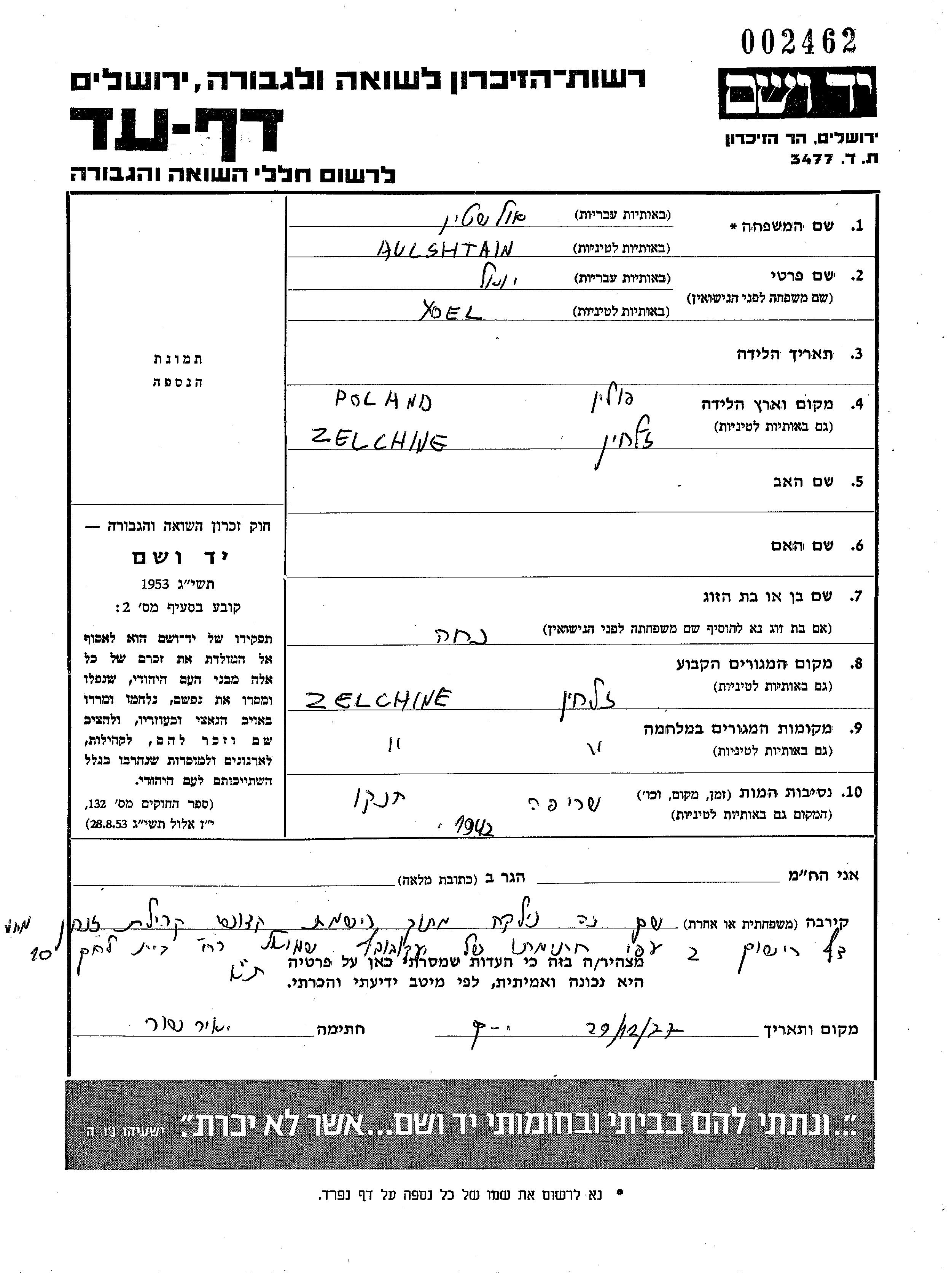 Ольштайн Йоэль Жихлин, Польша Лист свидетельских показаний