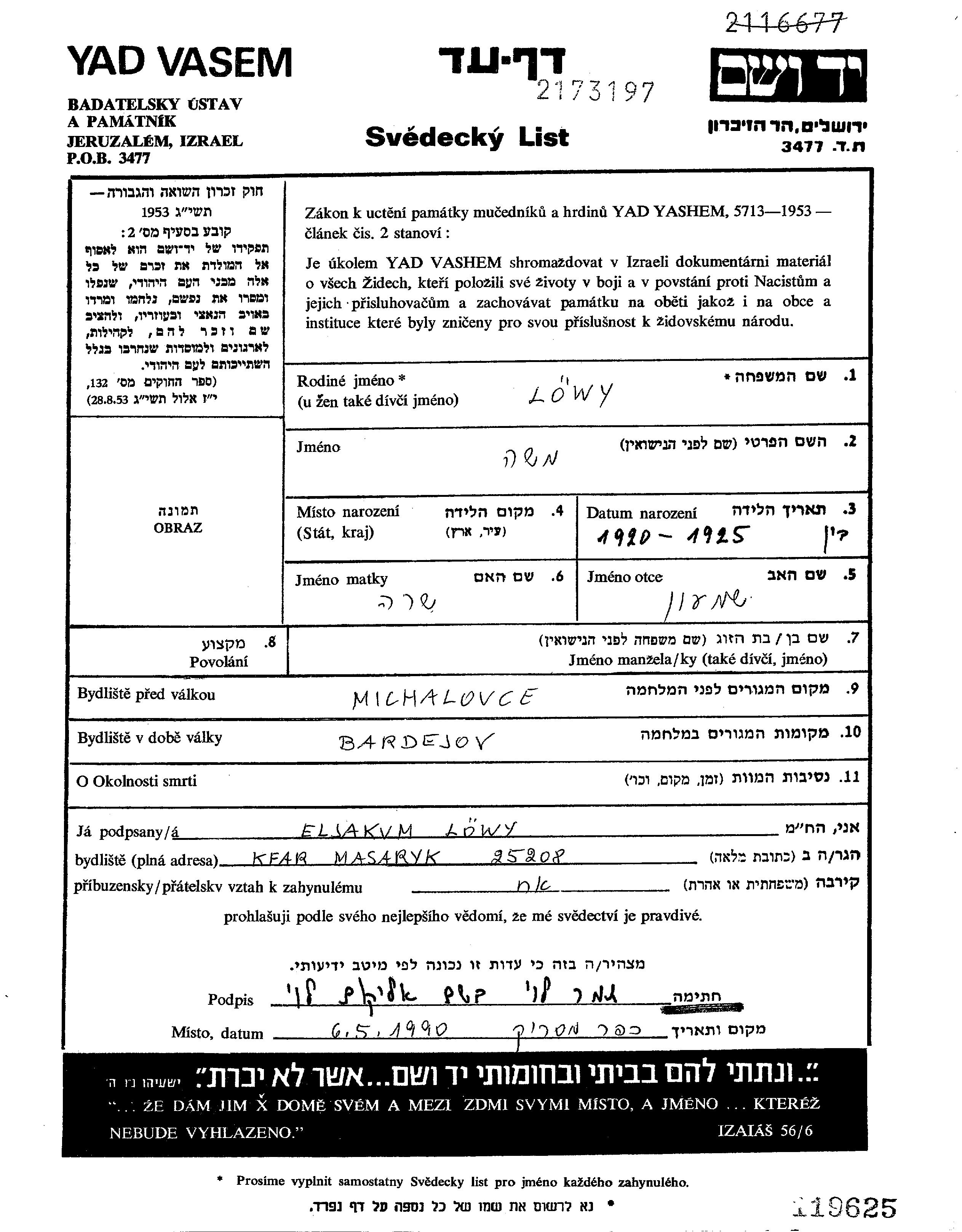 Лёви Моше 1923 Михаловце, Чехословакия Лист свидетельских показаний
