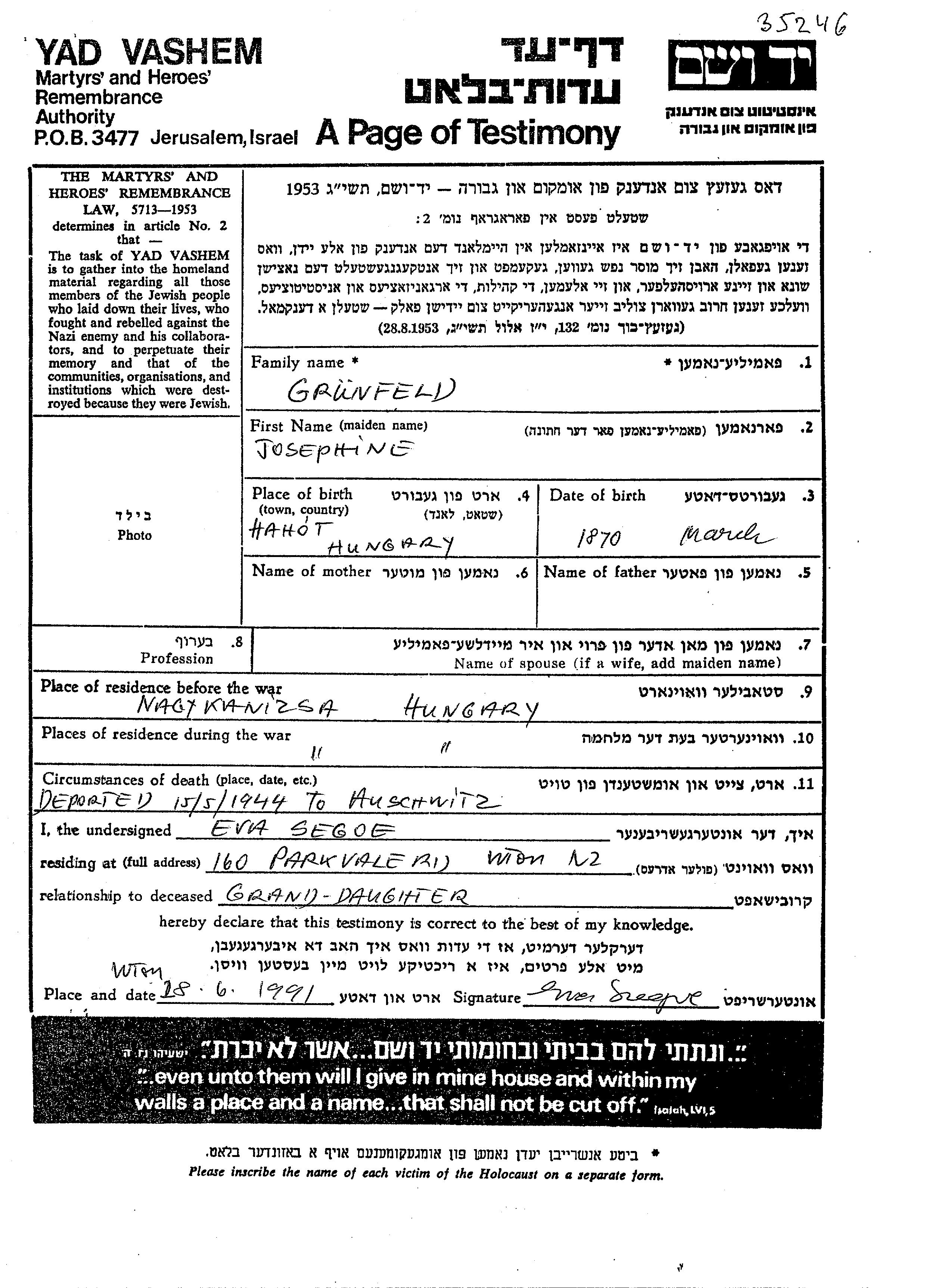 Жозефин Грюнфельд, место рождения: Хахот, Венгрия. Женат / замужем. Место жительства до войны: Надьканижа, Венгрия. Место во время войны: Надьканижа, Венгрия.