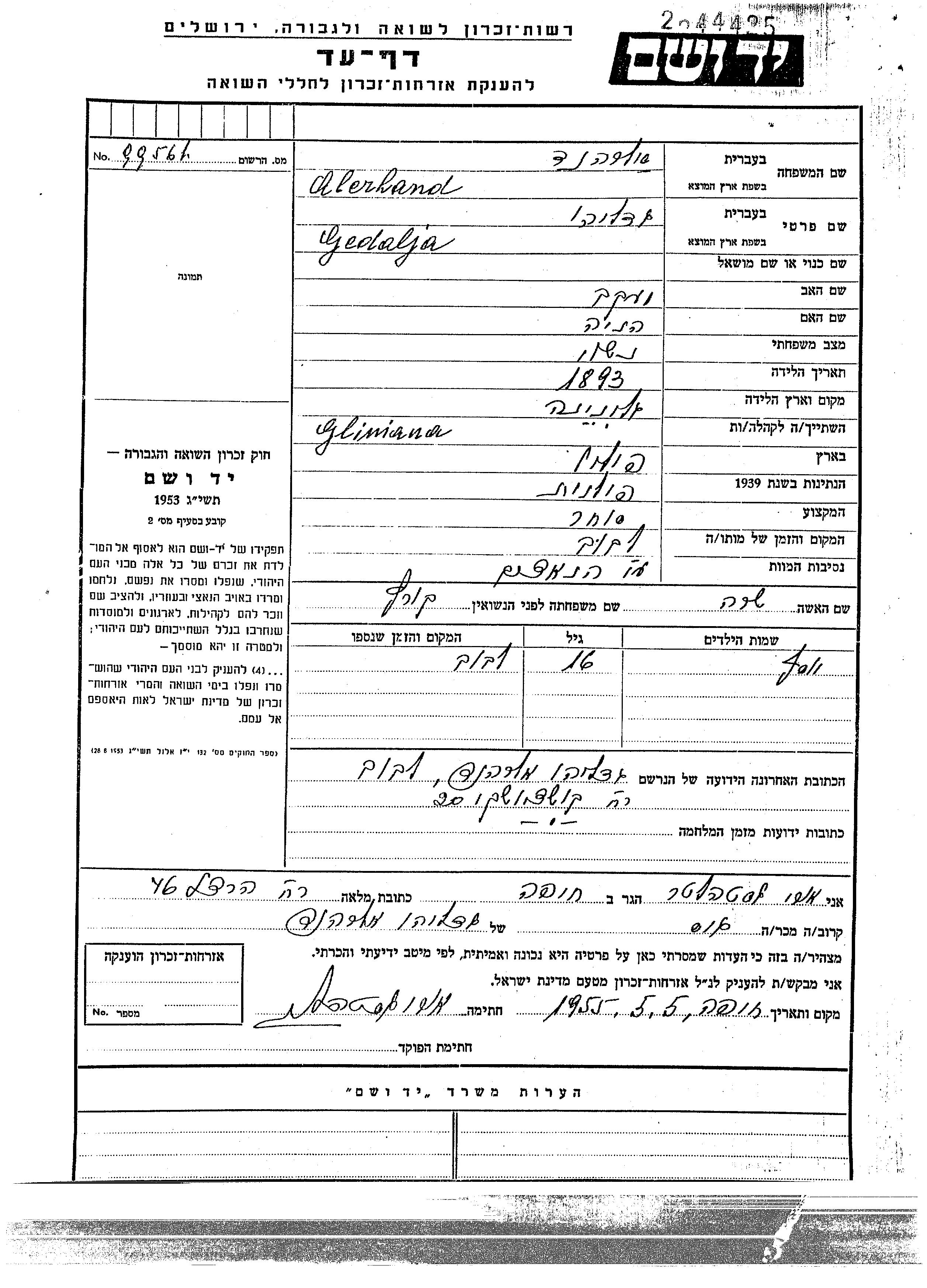 Алерханд Иосеф Gliniany, Poland Лист свидетельских показаний