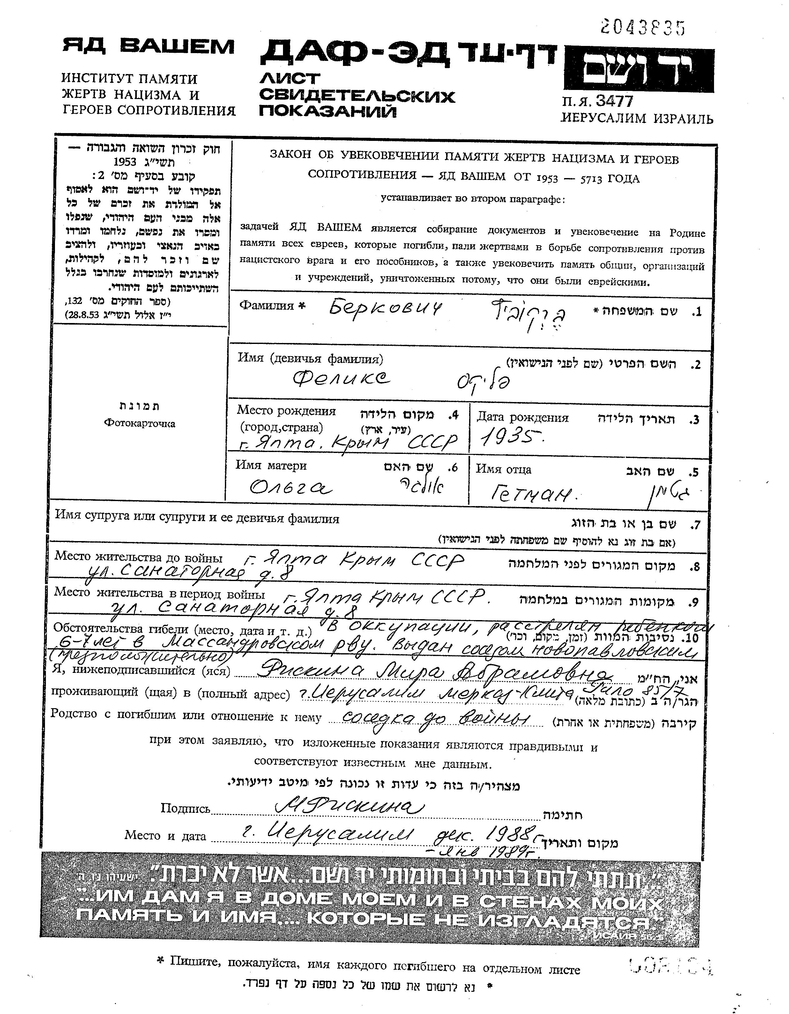 Беркович Феликс 1935 Ялта, Россия (СССР) Лист свидетельских показаний