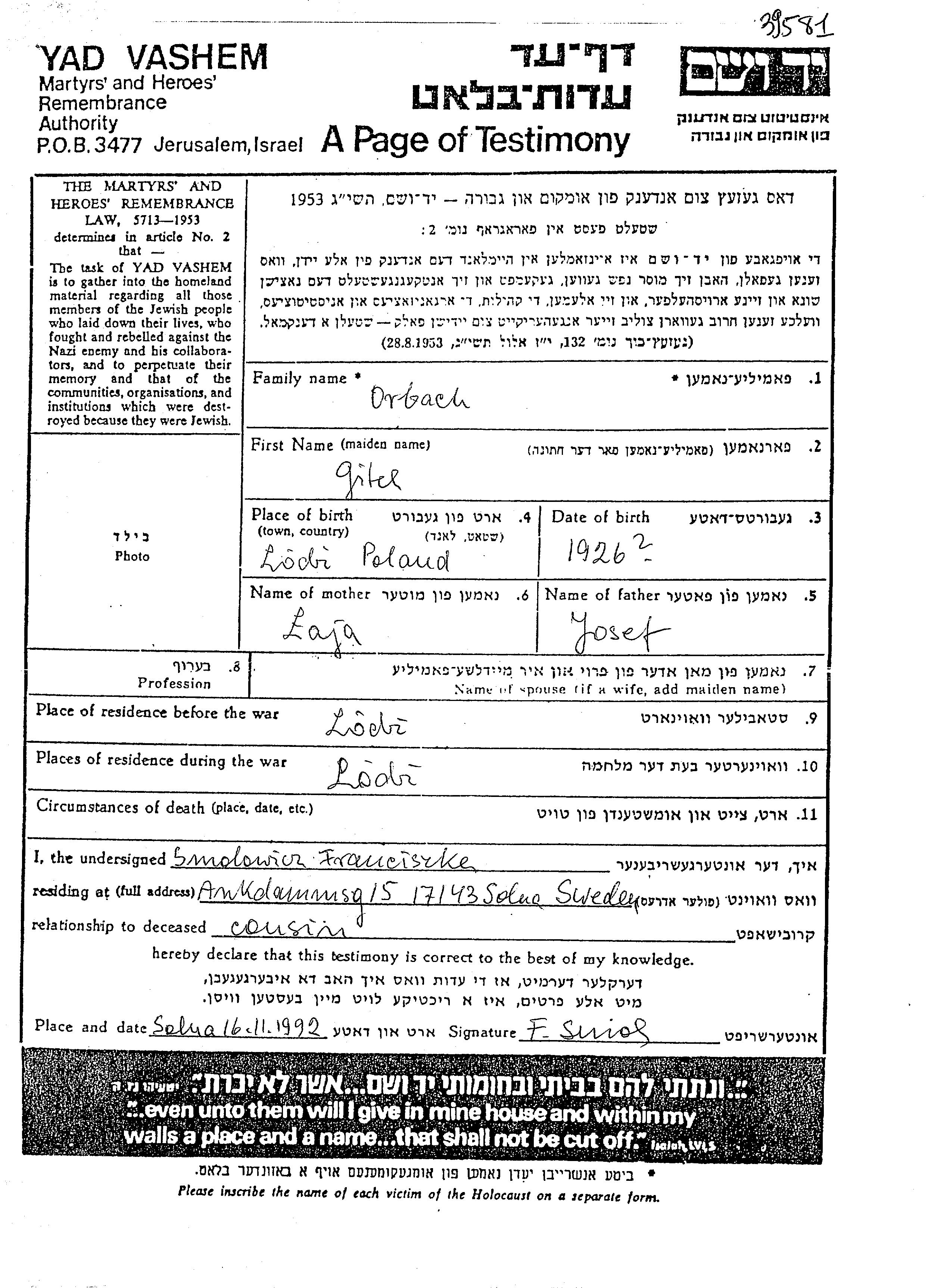 Орбах Гитель 1926 Лодзь, Польша Лист свидетельских показаний