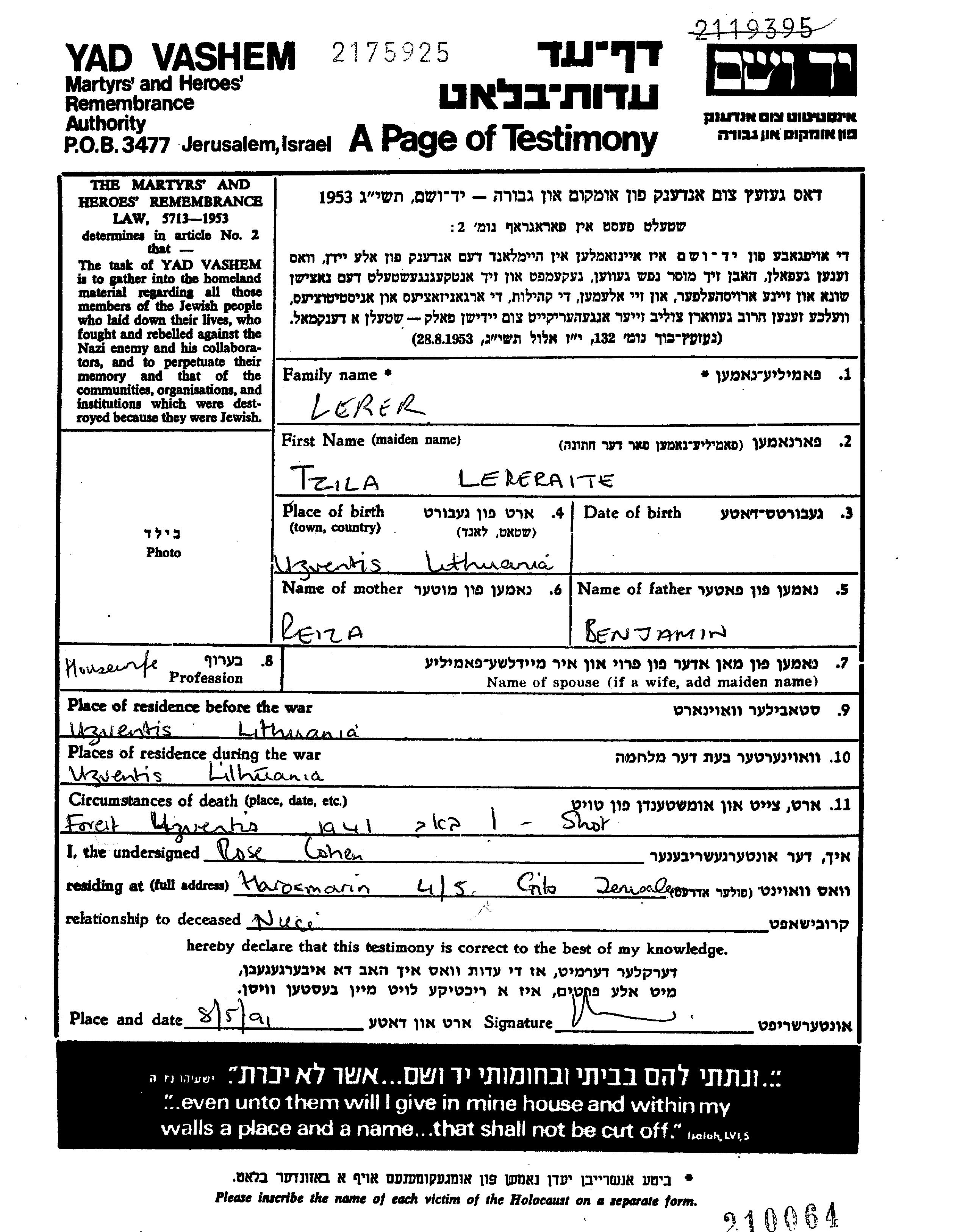 Во время Шоа евреев уничтожали разными способами: газовые камеры, расстрелы, их заживо хоронили или сжигали, непосильным принудительным трудом, голодом, эпидемиями, отсутствием минимальных гигиенических условий и медицинского обслуживания, и т.д. Некоторые евреи добровольно расстались со своей жизнью, чтобы избежать ареста и дальнейших преследований или чтобы покончить с безысходностью и бесконечными страданиями.