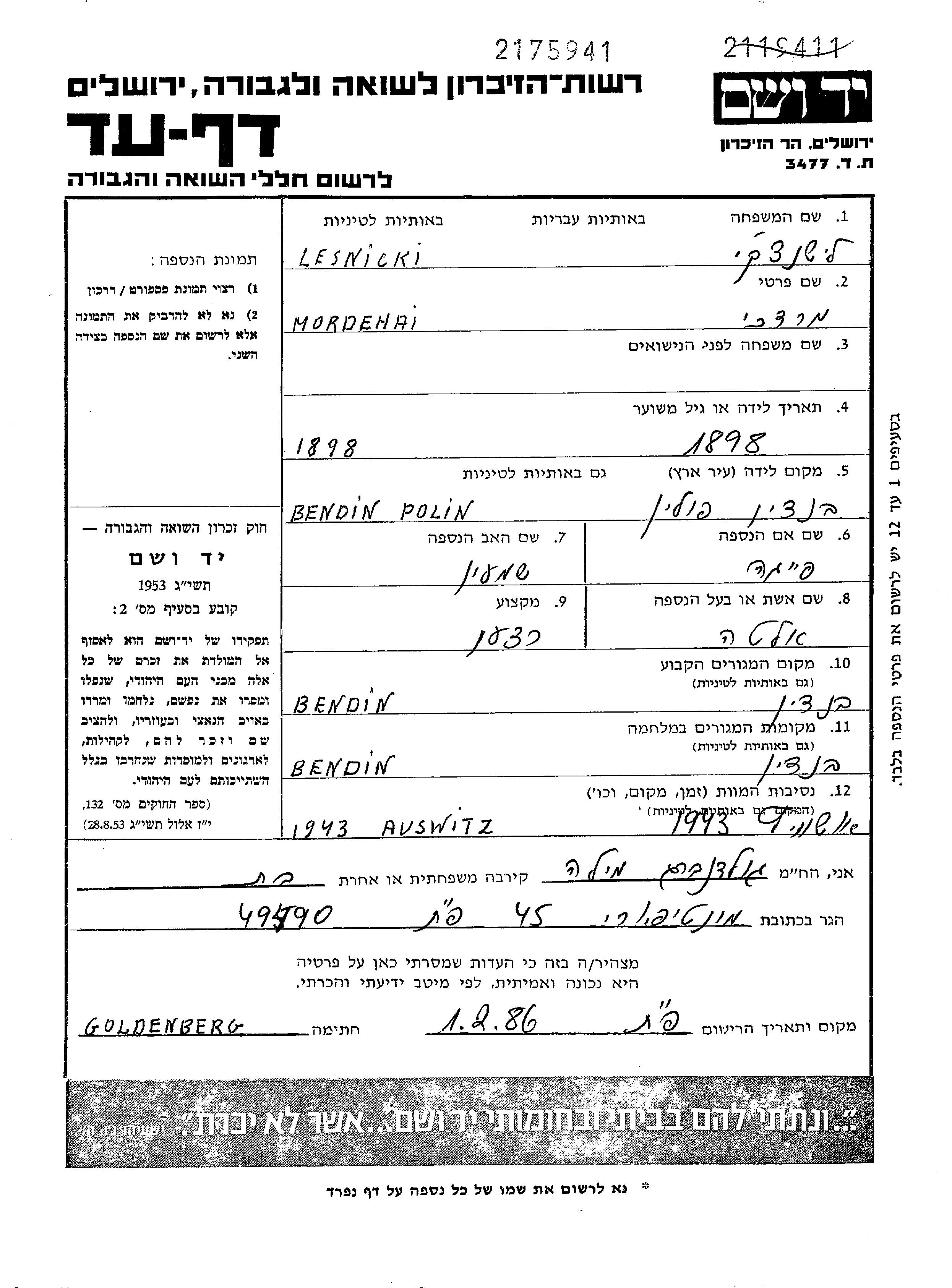 Мордехай Лесницки Лешницки, место рождения: Бендзин, Польша. Отец: Шимон, mать:Фейга. Кожевник. Женат / замужем. Место жительства до войны: Бендзин, Польша. Место во время войны: Бендзин, Польша.