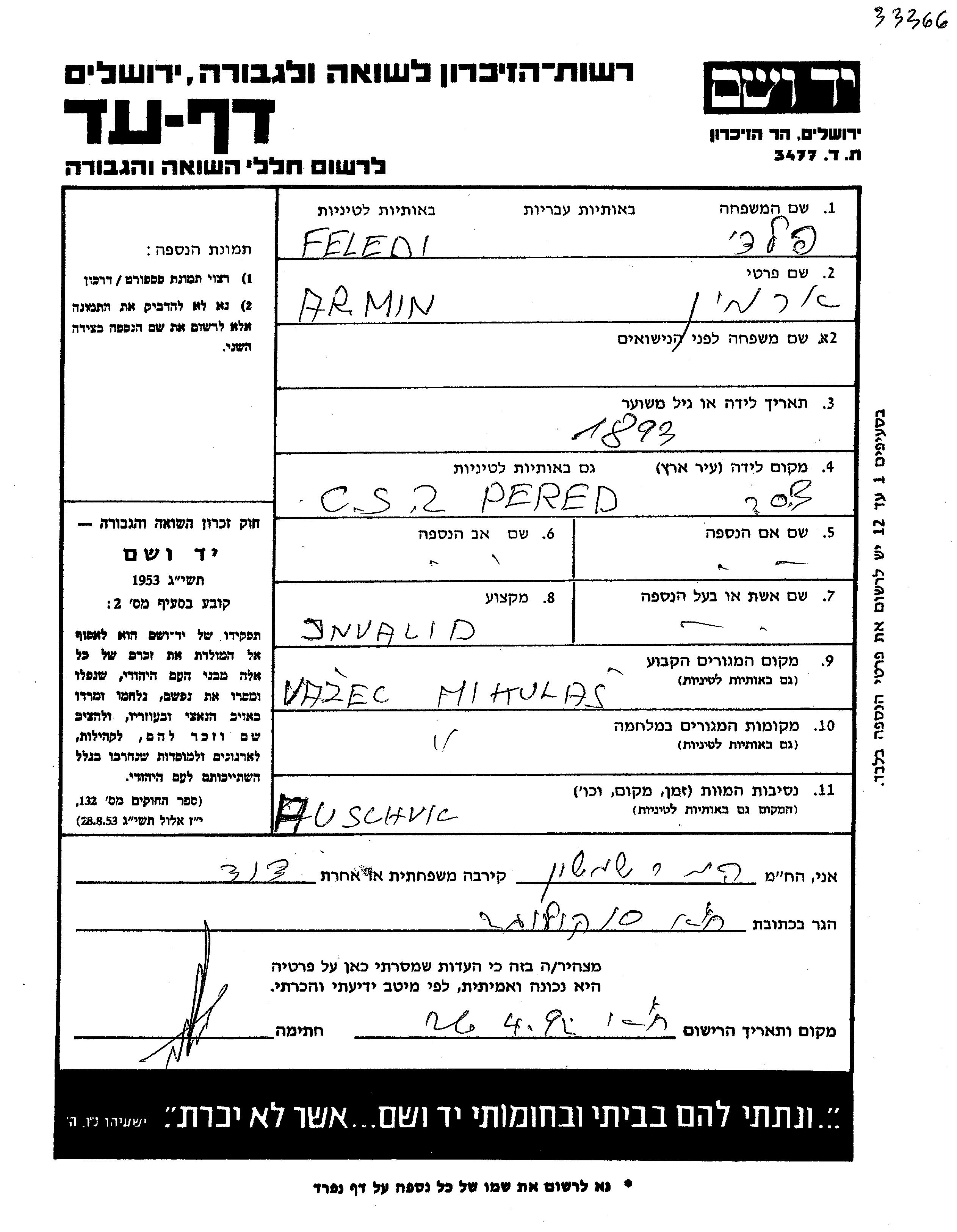 Армин Феледи, место рождения: Перед, Чехословакия. Место жительства до войны: Важец, Чехословакия. Место во время войны: Важец, Чехословакия.