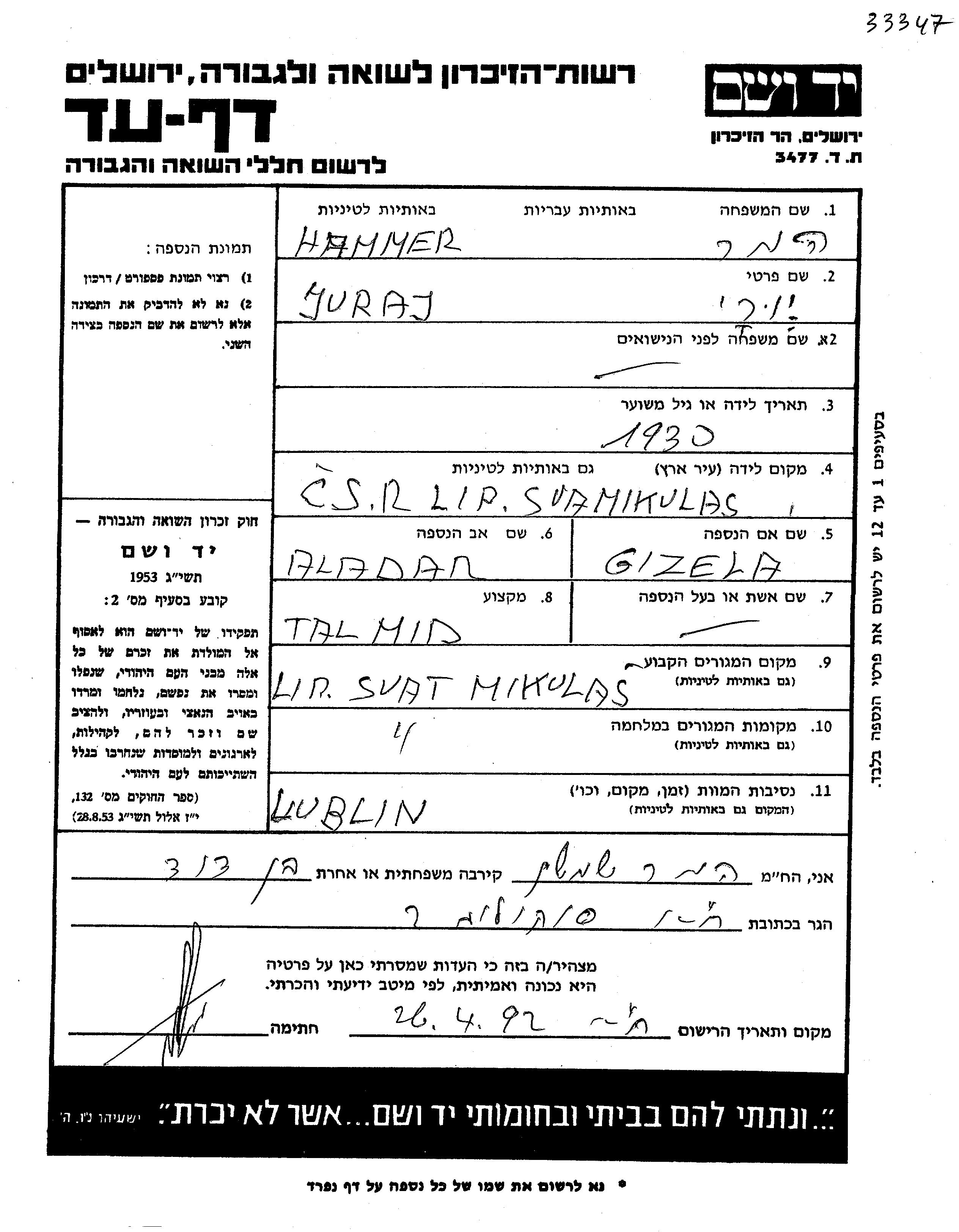 Юрай Хаммер, место рождения: Микулаш-Липтовский-Святы, Чехословакия. Отец: Аладар, mать:Гизела. Ученик / ученица. Ребенок. Место жительства до войны: Липтовский-Святы, Чехословакия. Место во время войны: Липтовский-Святы, Чехословакия.