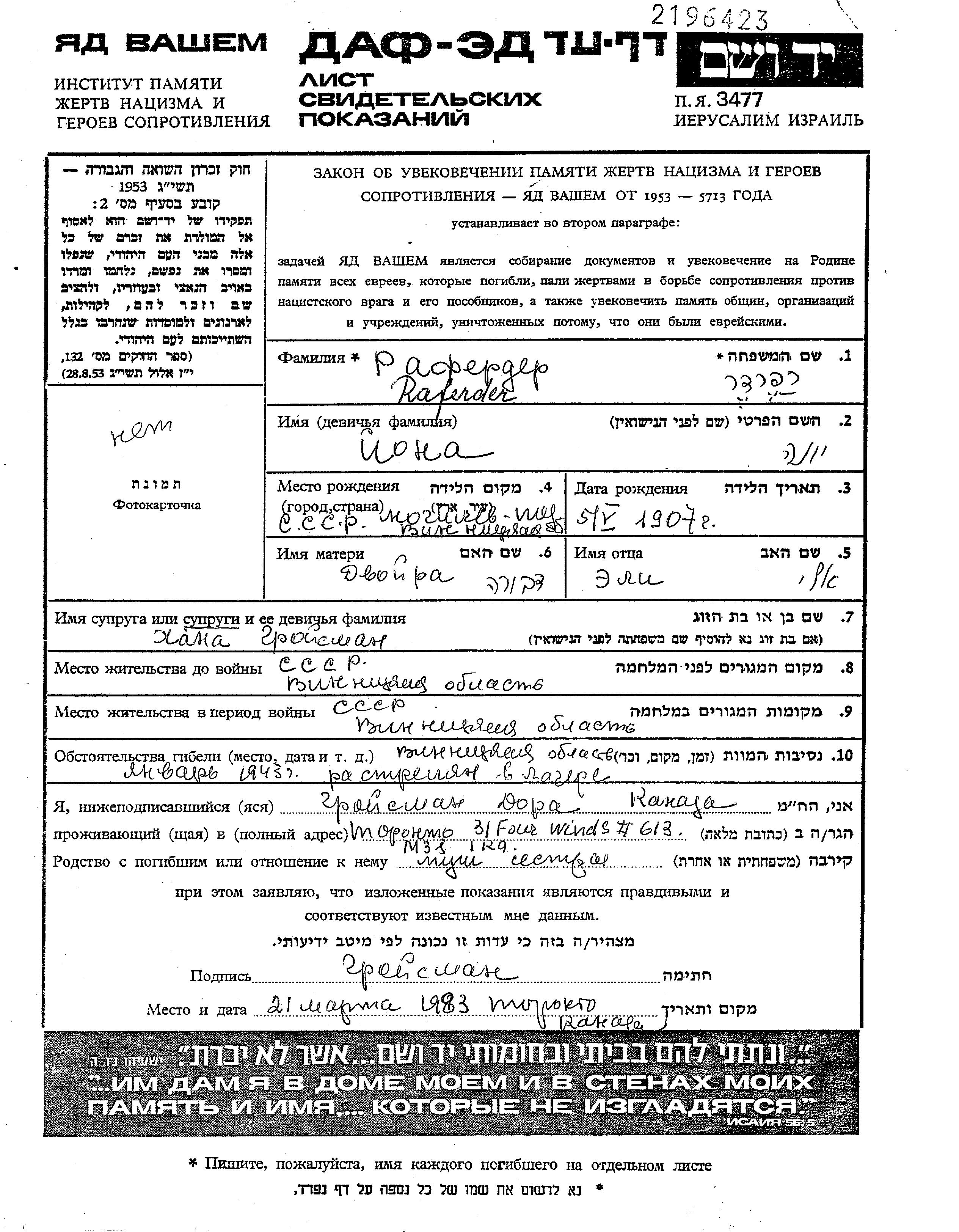 Рафердер Иона 1907 Винница, Украина (СССР) Лист свидетельских показаний