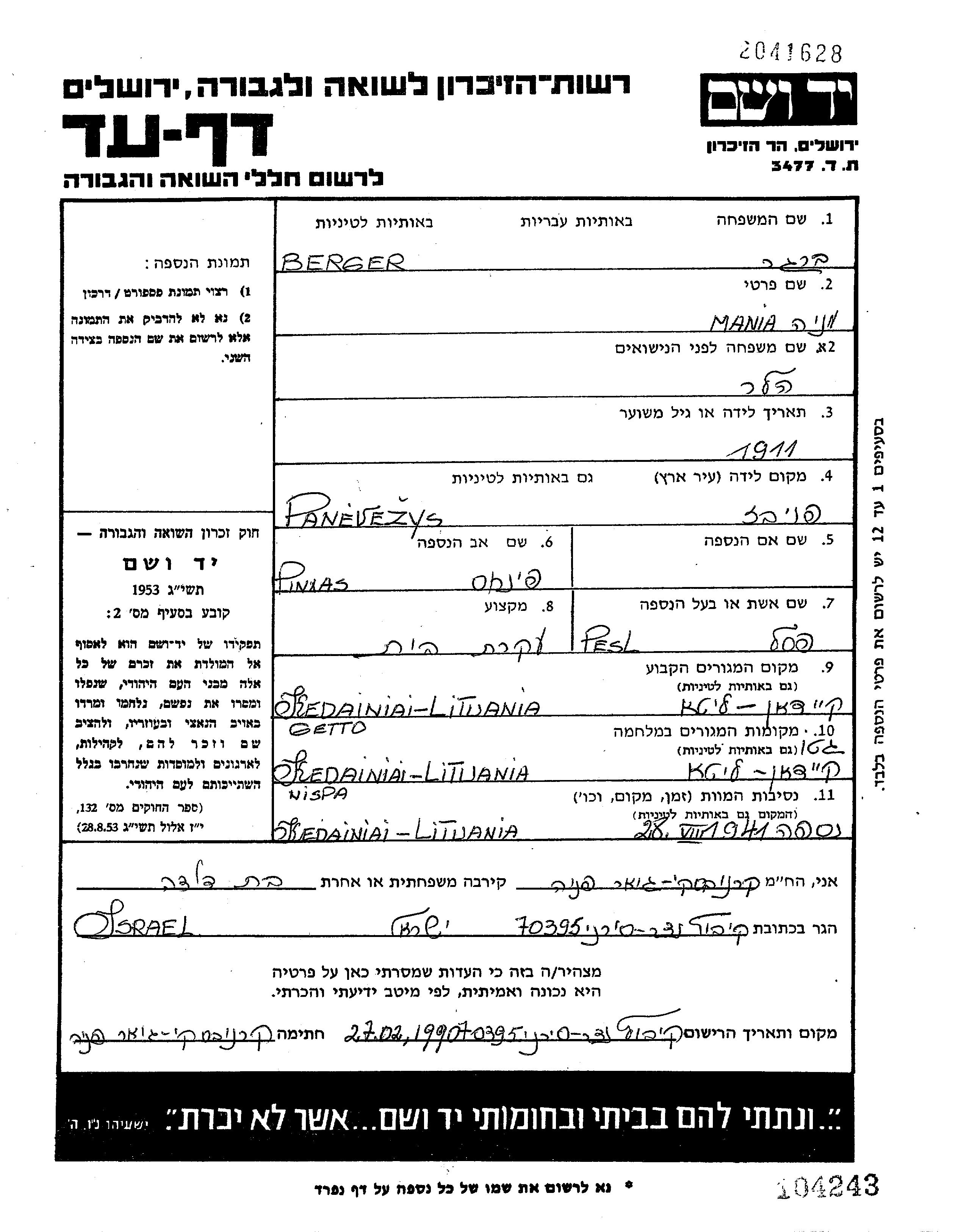 Бергер Маня 1911 Кейданяй, Литва Лист свидетельских показаний