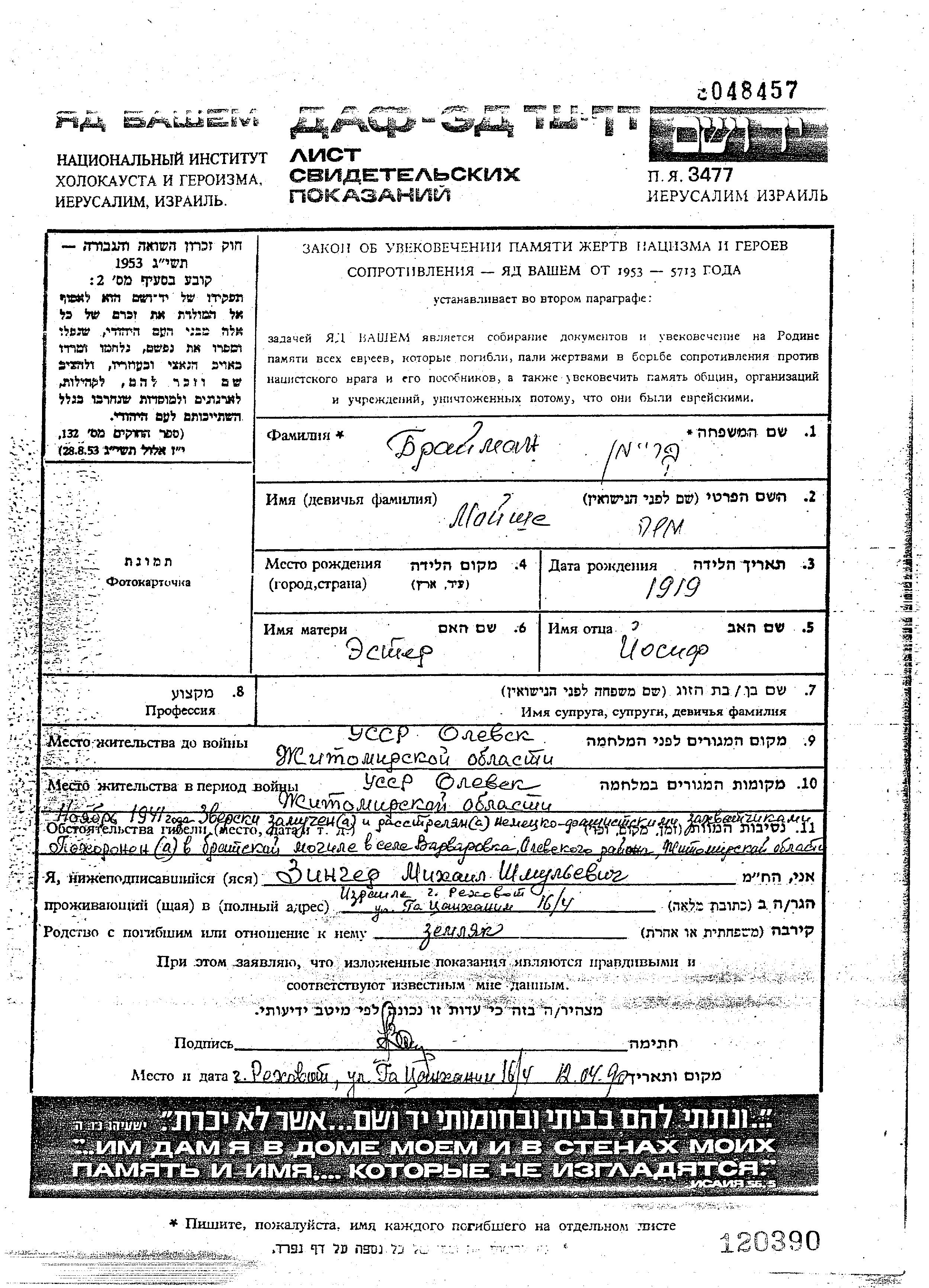 Брейман Мойше 1919 Олевск, Украина (СССР) Лист свидетельских показаний