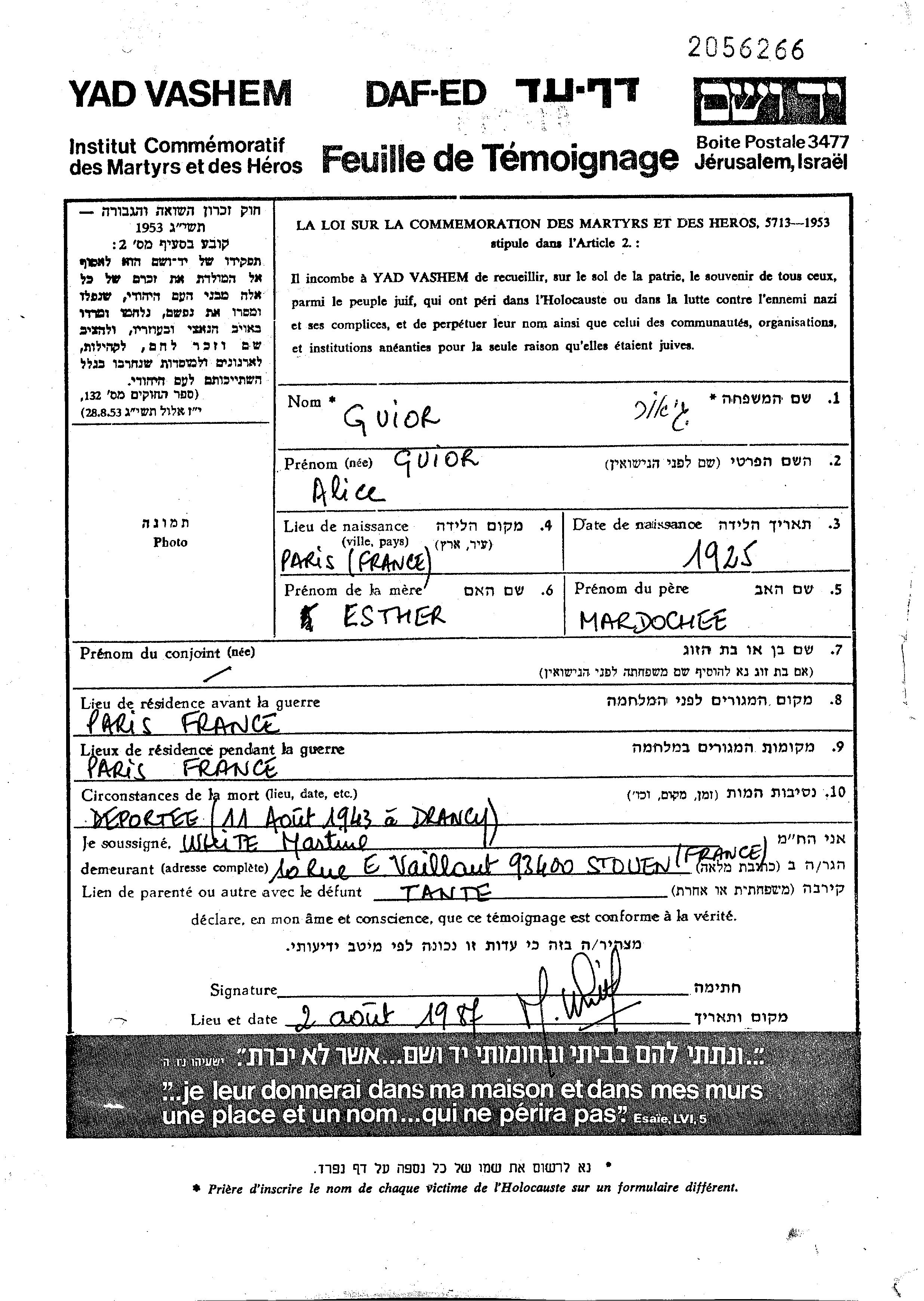 Алис Гиор, место рождения: Париж, Франция. Отец: Мардоше, mать:Эстер, девичья фамилия Хериф. Место жительства до войны: Париж, Франция. Место во время войны: Париж, Франция.