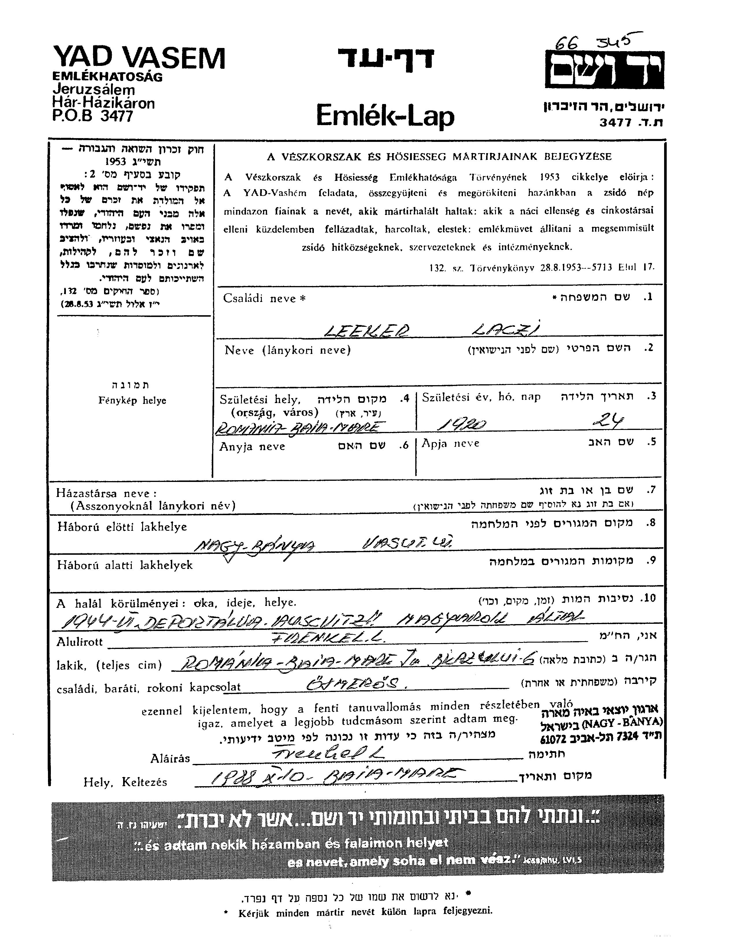 Лаци Лекер, место рождения: Надьбаня, Румыния. Холост / не замужем. Место жительства до войны: Надьбаня, Румыния.