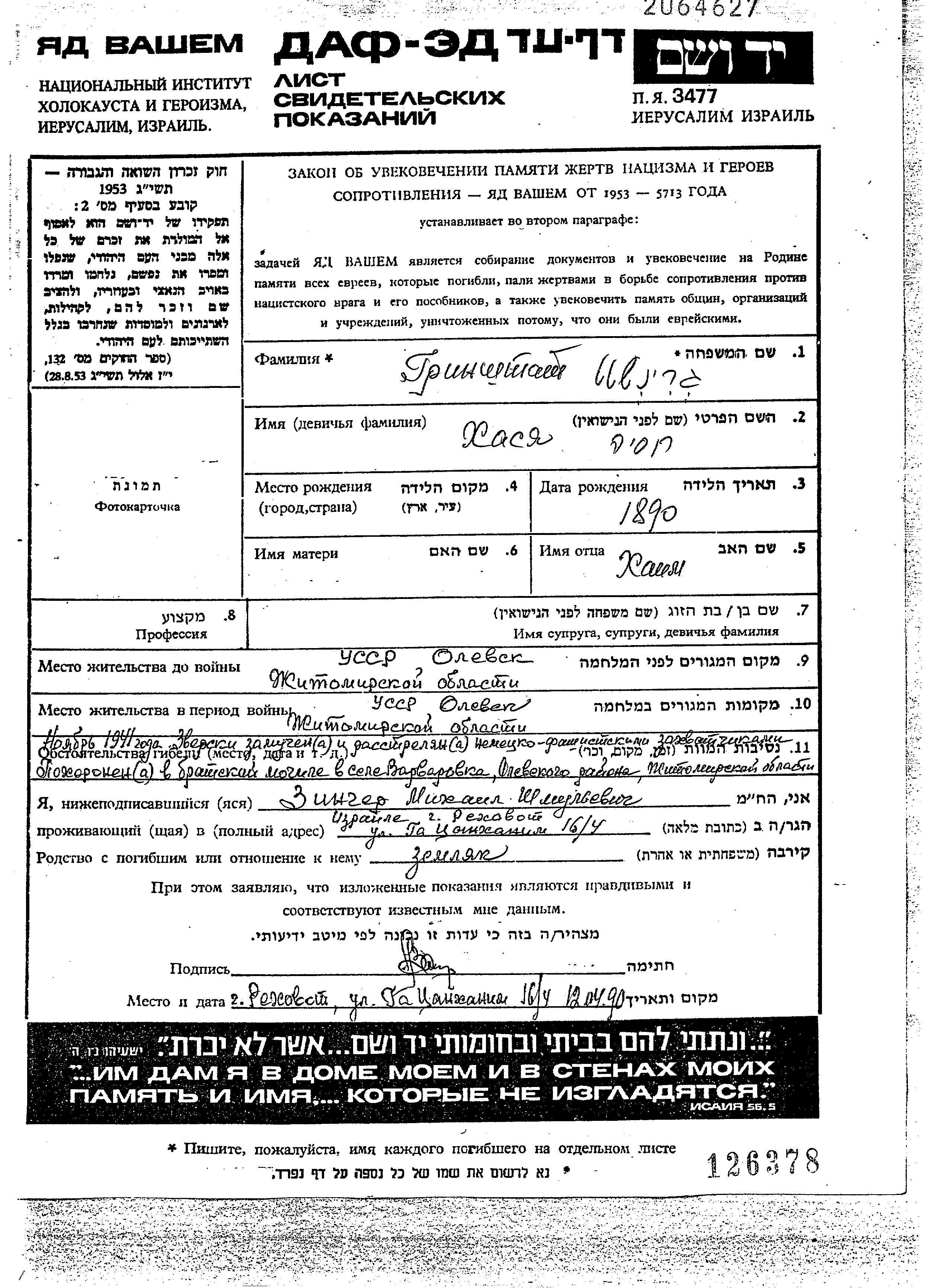 Яд Вашем - Листы свидетельских показаний Мемориального фонда