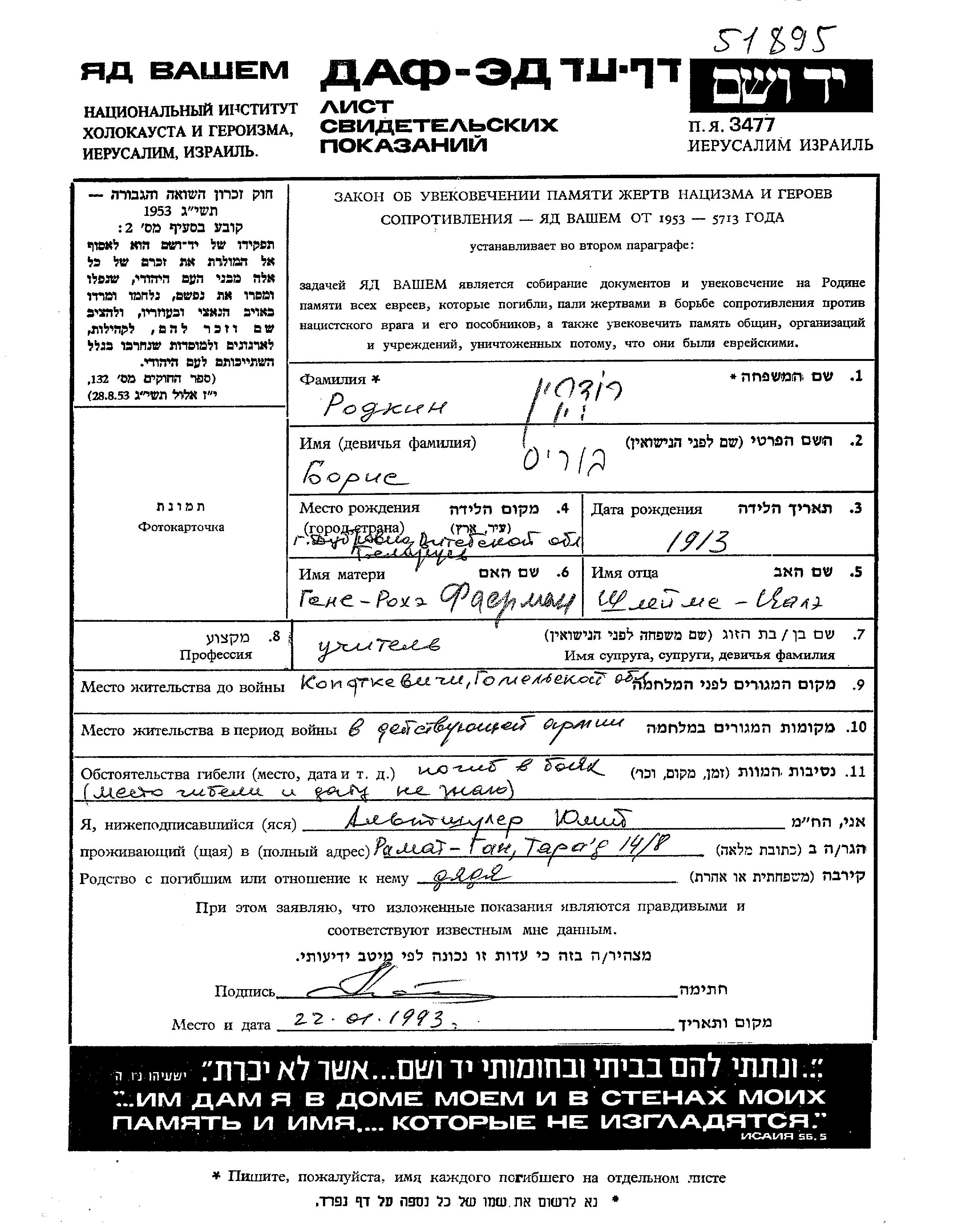 Борис Родкин, место рождения: Дубровно, Белоруссия (СССР). Отец: Шлейме Цила Цале, mать:Гене Рохе, девичья фамилия Фаерман. Учитель / учительница. Место жительства до войны: Копаткевичи, Белоруссия (СССР). Место во время войны: Вооруженные силы Советского Союза. Борис погиб на военной службе.