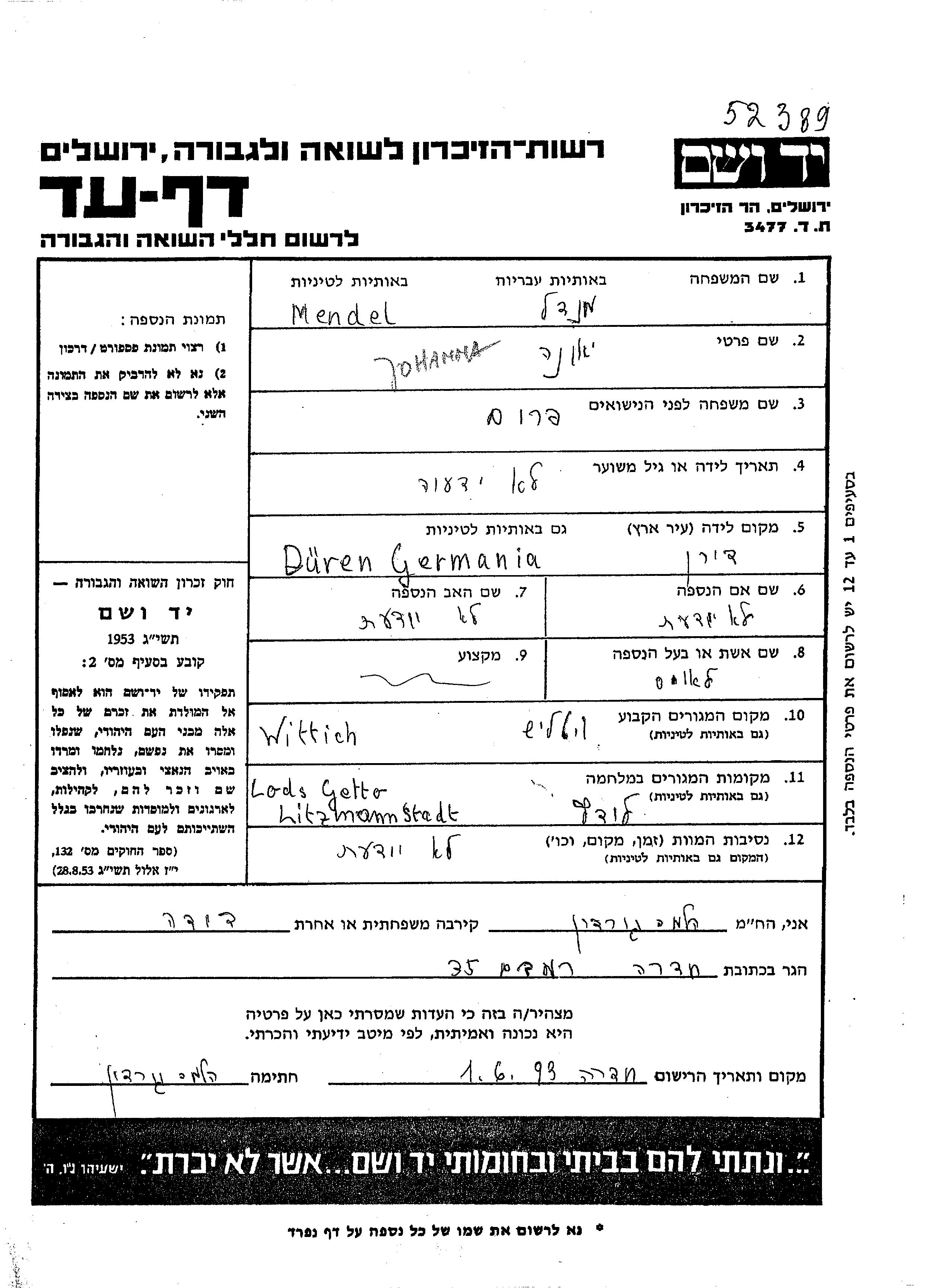 Йоханна Мендель, девичья фамилия Фрум, место рождения: Дюрен, Германия. Женат / замужем. Место жительства до войны: Виттлих, Германия. Место во время войны: Лодзь, Польша.