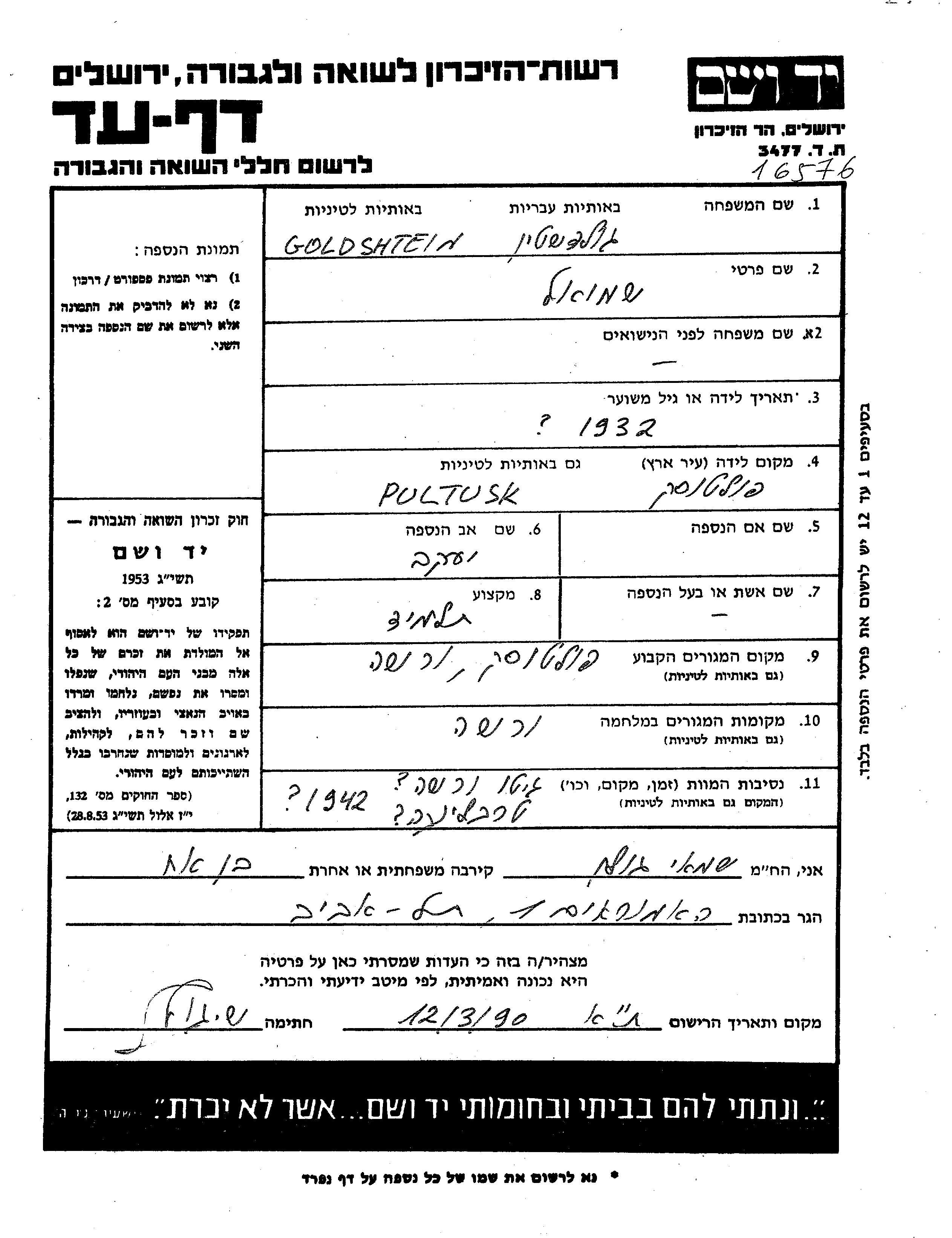 Гольдштейн Шмуэль 1932 Пултуск, Польша Лист свидетельских показаний