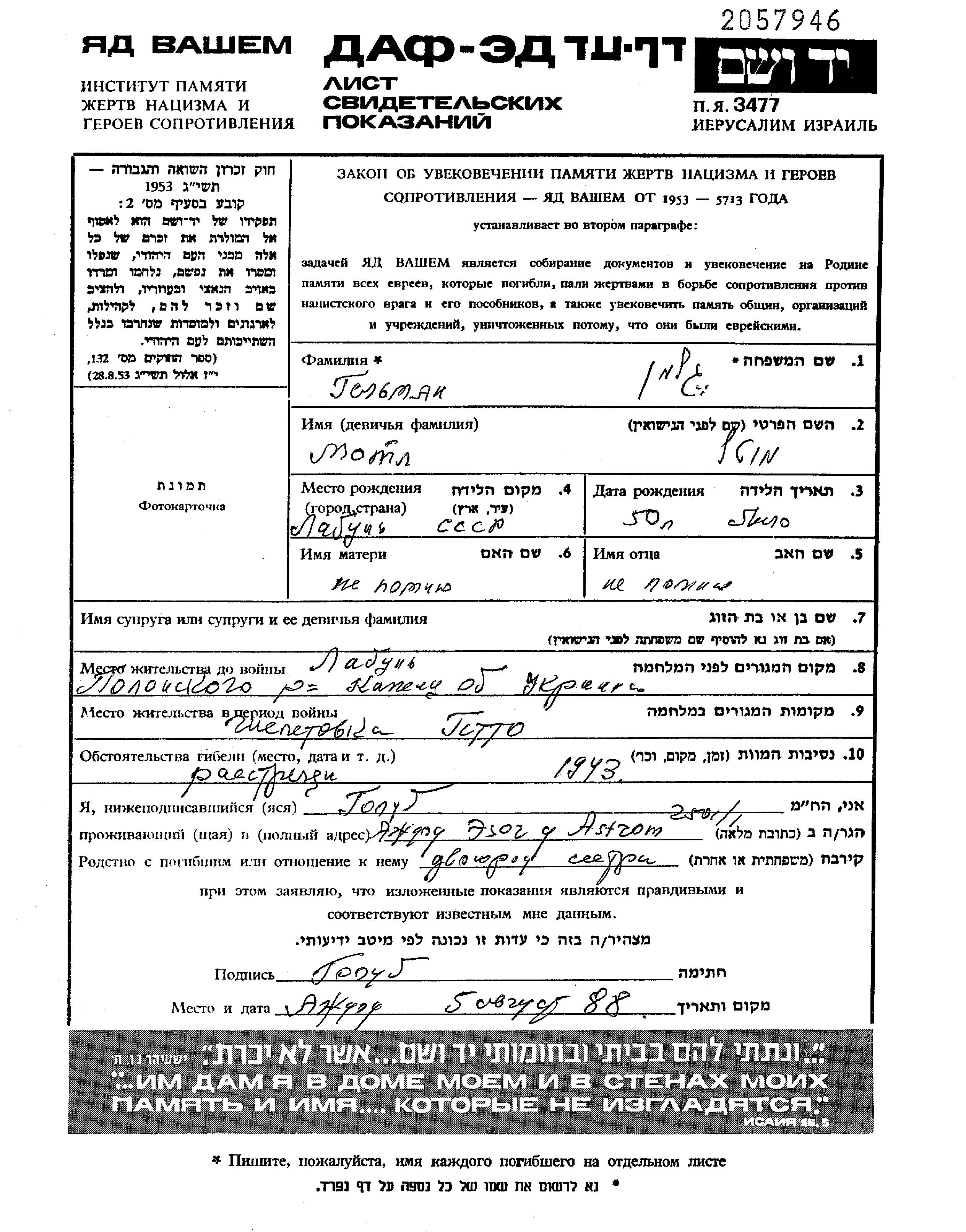 Гельман Мотл 1893 Лабунь, Украина (СССР) Лист свидетельских показаний