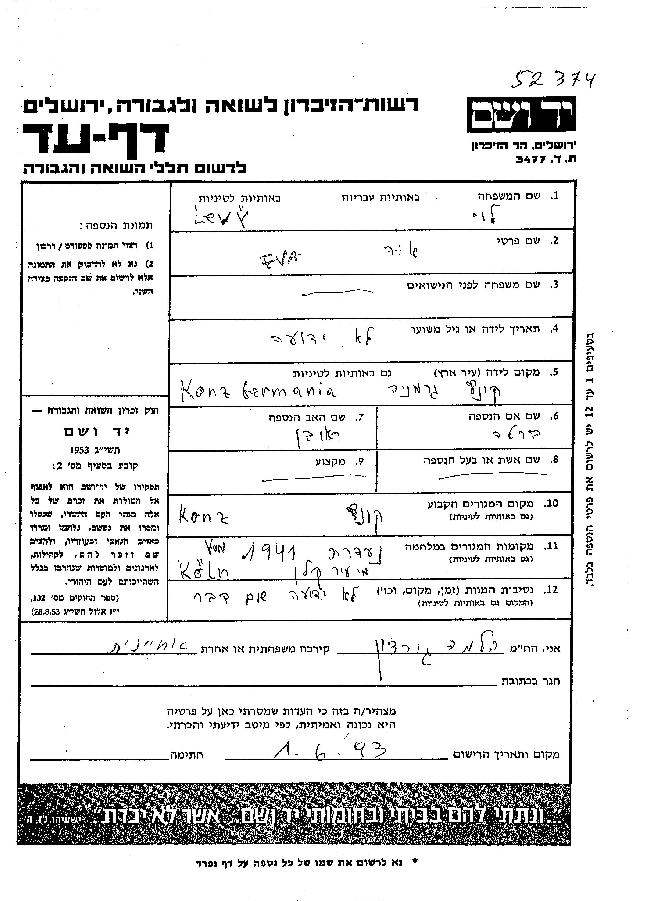 Эва Леви, место рождения: Конц, Германия. Отец: Реувен, mать:Берта. Место жительства до войны: Конц, Германия. Место во время войны: Кёльн, Германия.
