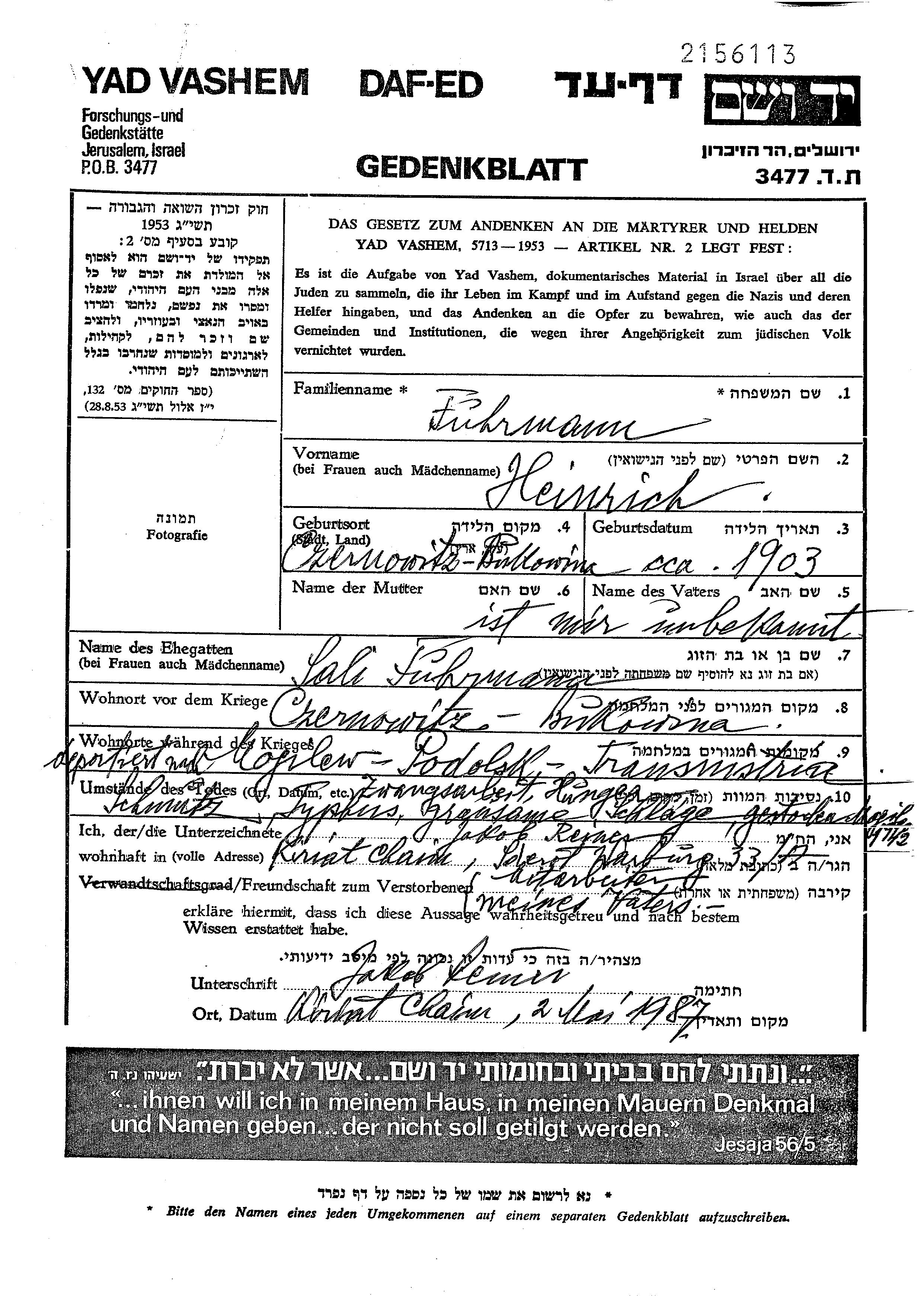 Фурманн Хайнрих 1903 Черновцы, Румыния Лист свидетельских показаний