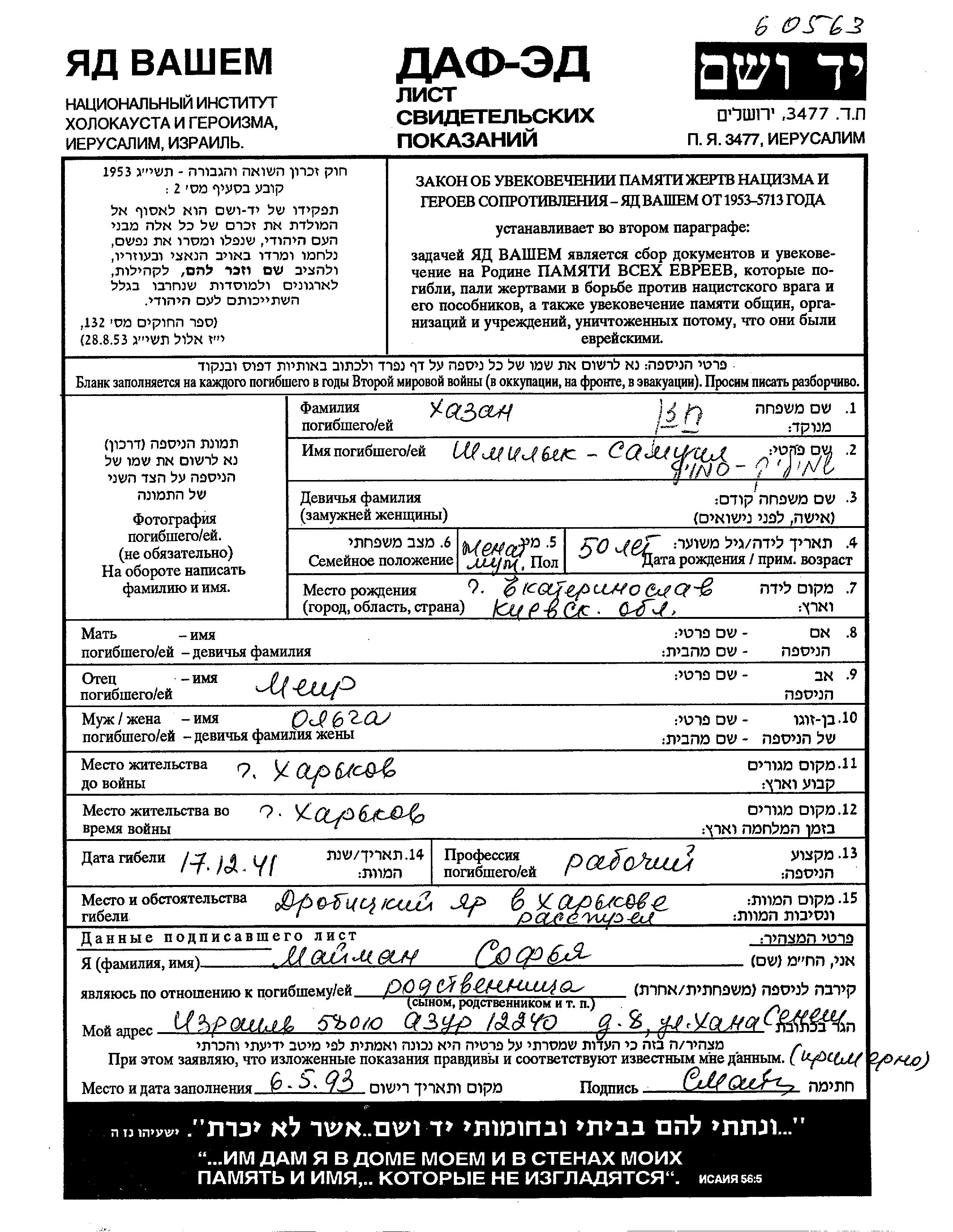 Хазан Шмилик Харьков, Украина (СССР) Лист свидетельских показаний