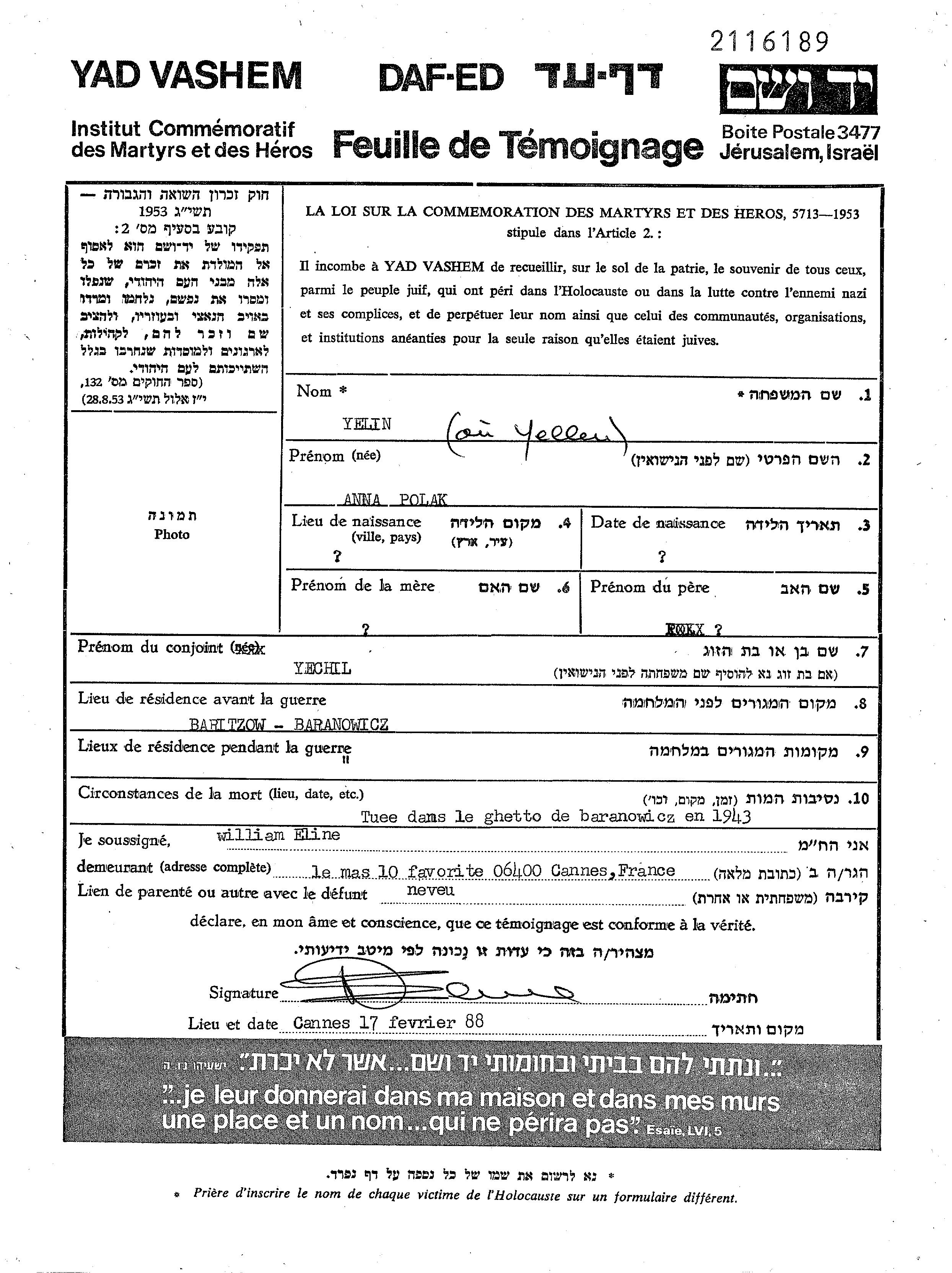Елин Анна Барановичи, Польша Лист свидетельских показаний
