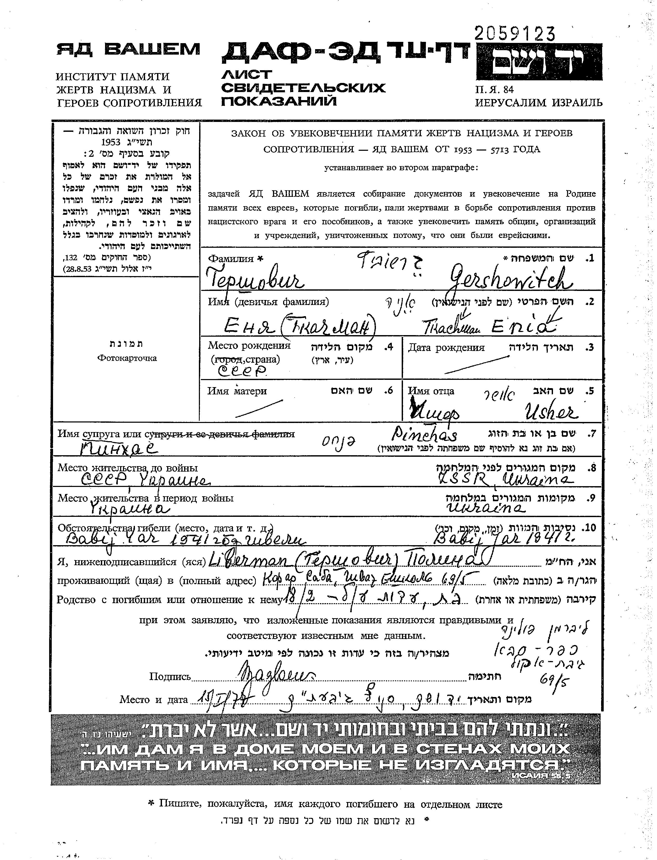 Гершович Эня Украина (СССР) Лист свидетельских показаний