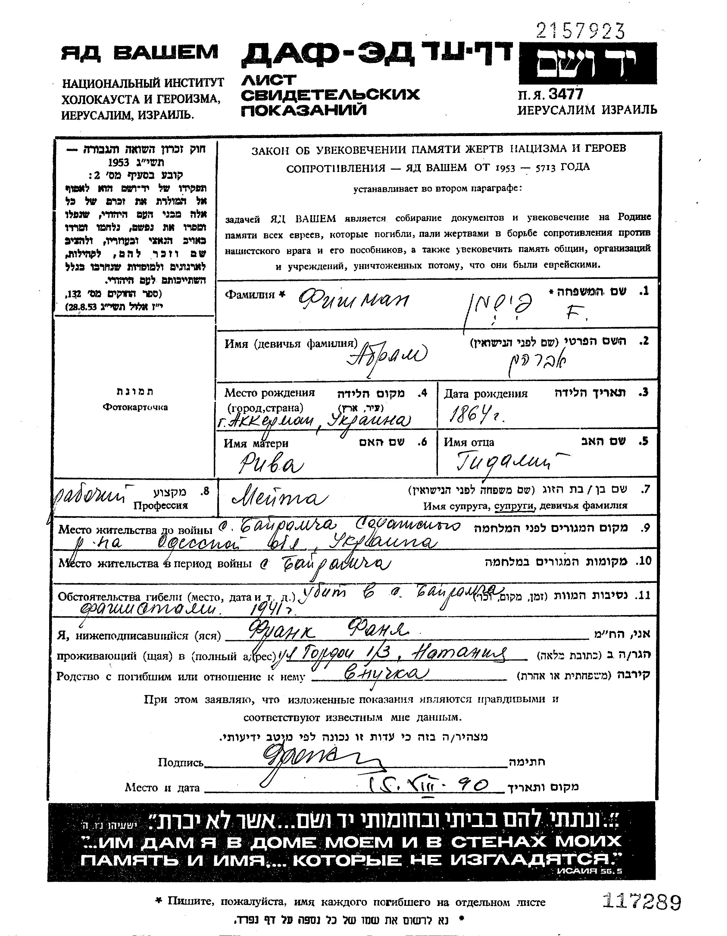Яд Вашем - Листы свидетельских показаний Мемориального фонда