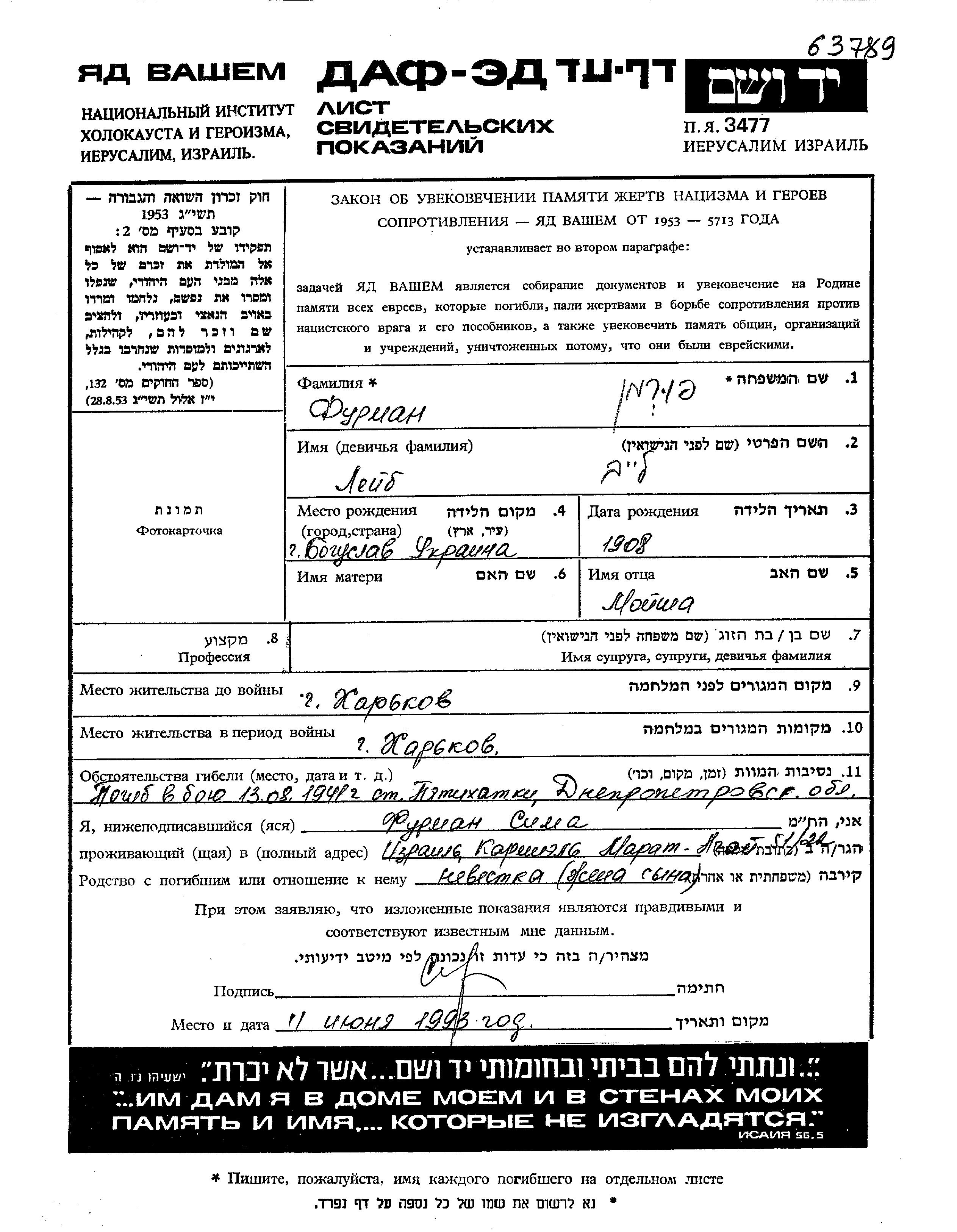 Лейб Фурман, место рождения: Богуслав, Украина (СССР). Отец: Мойша. Место жительства до войны: Харьков, Украина (СССР). Место во время войны: Вооруженные силы Советского Союза. Лейб погиб на военной службе. место смерти: Пятихатка, Украина (СССР) в 13/08/1941.