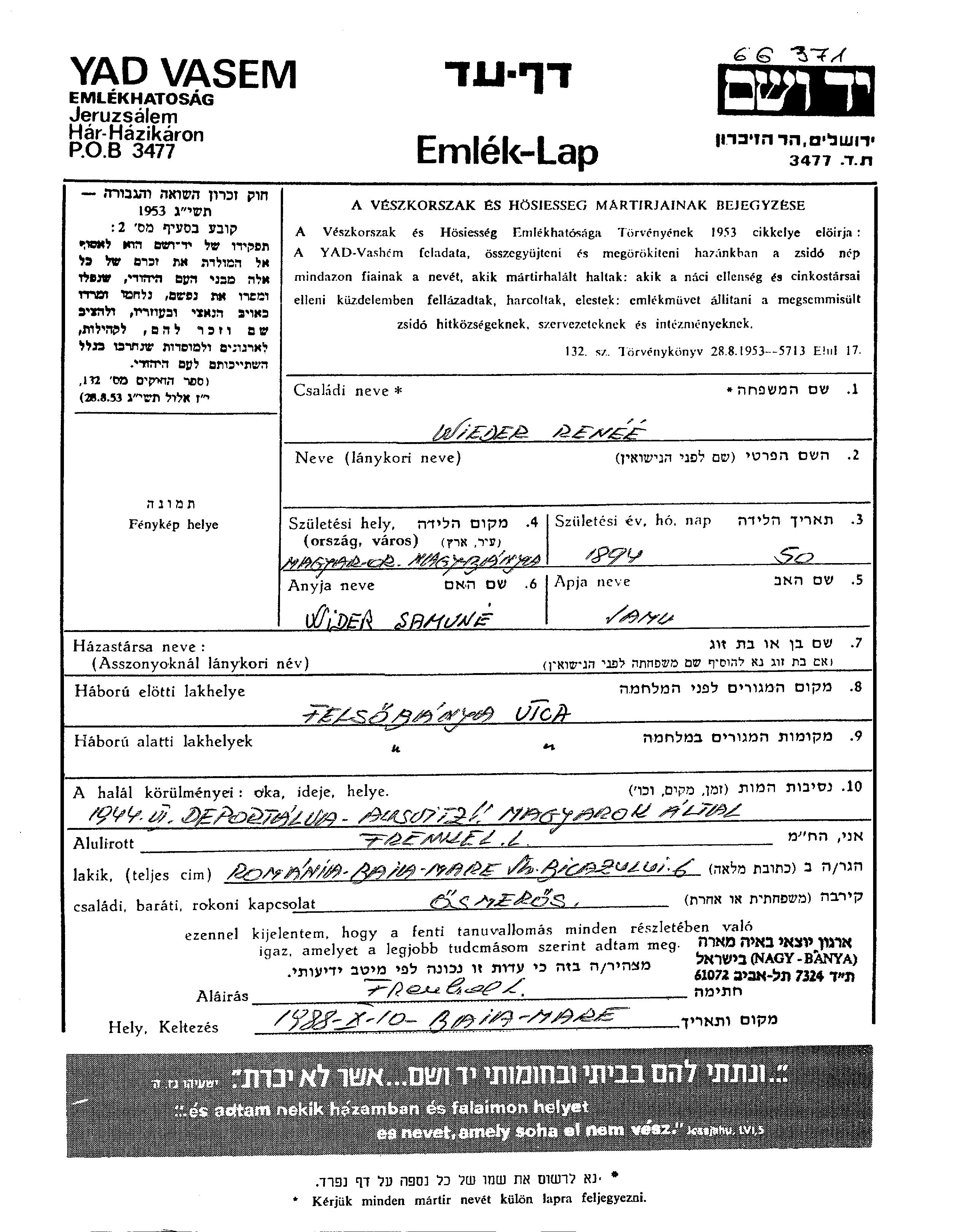 Видер Рене 1894 Надьбаня, Румыния Лист свидетельских показаний