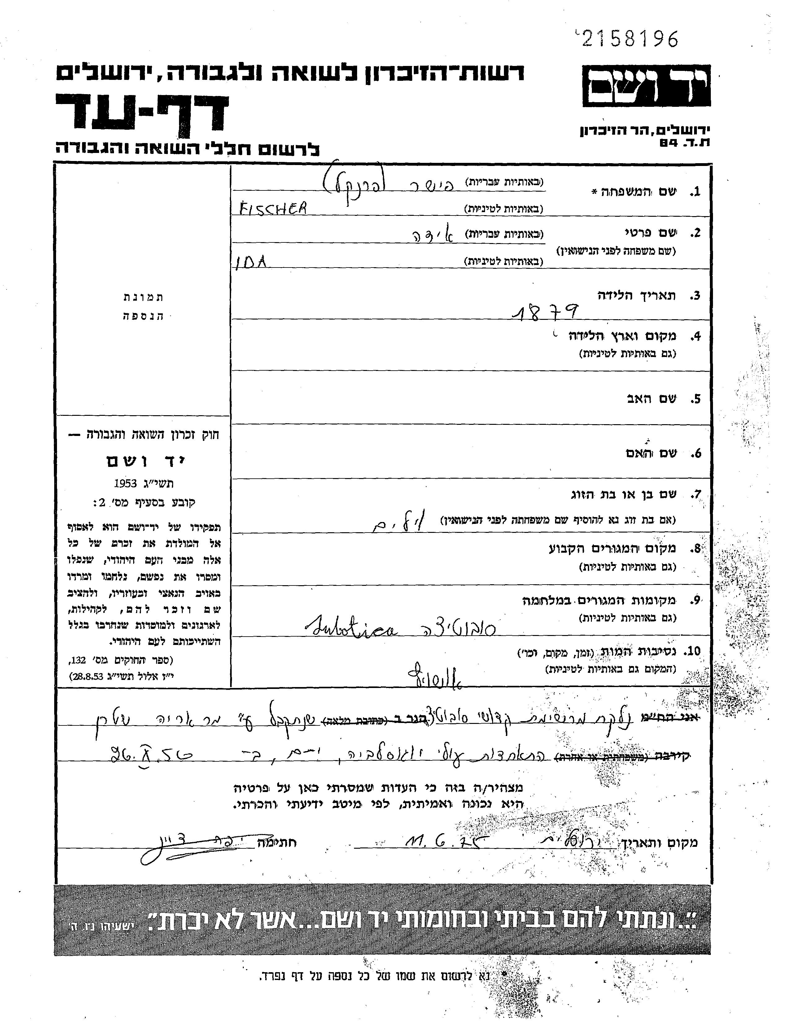 Ида Фишер, девичья фамилия Френкель. Женат / замужем. Место жительства до войны: Суботица, Югославия. Место во время войны: Суботица, Югославия.