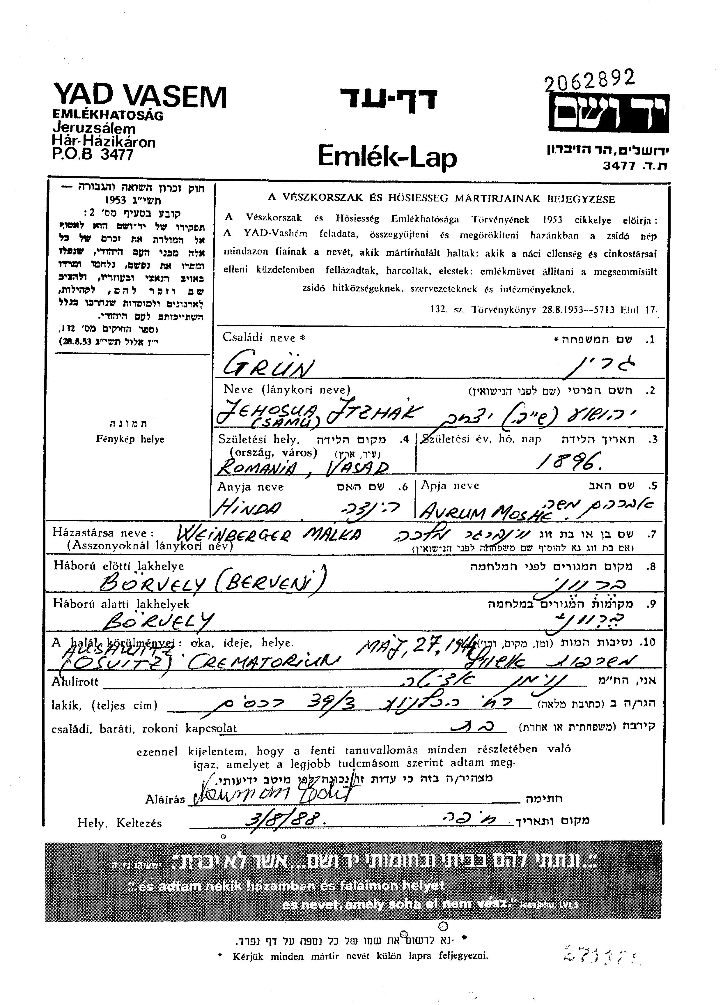 Егошуа Ицхак Шая Грюн, место рождения: Вэшад, Румыния. Отец: Аврум Моше, mать:Хинда. Женат / замужем. Место жительства до войны: Борвей, Румыния. Место во время войны: Борвей, Румыния.
