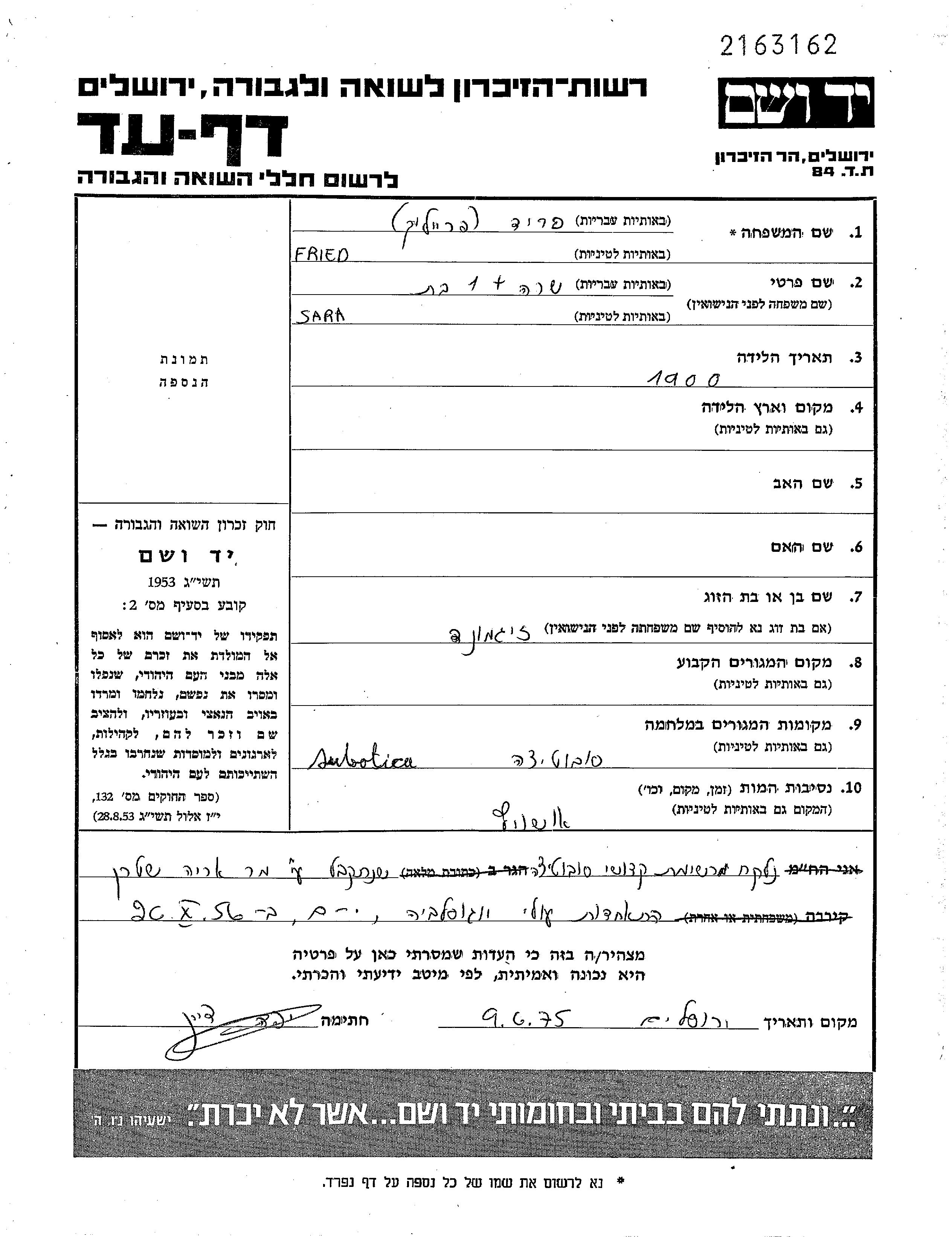 Фрид Сара 1900 место не указано, Лист свидетельских показаний