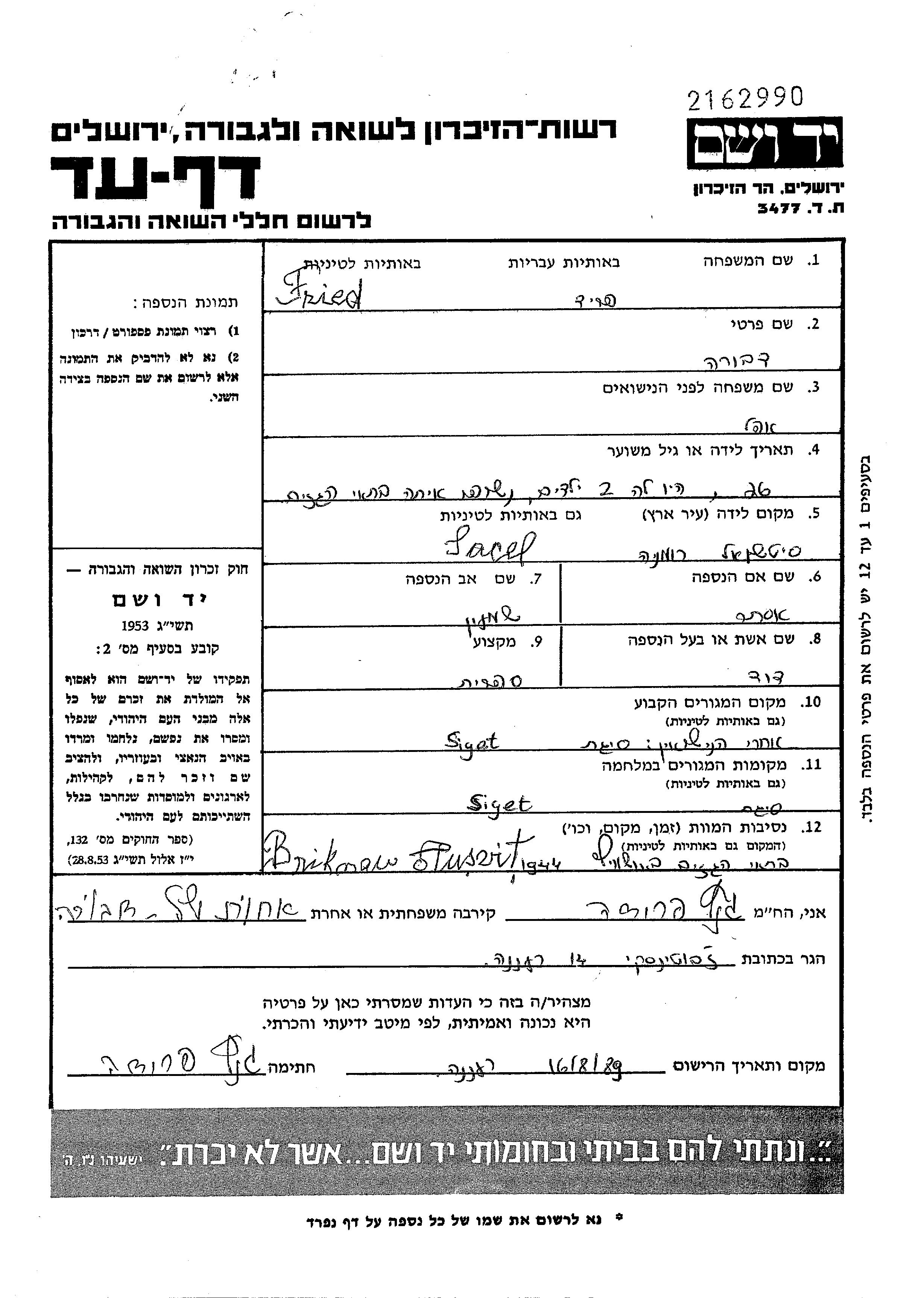 Фрид Двора Сигет, Румыния Лист свидетельских показаний