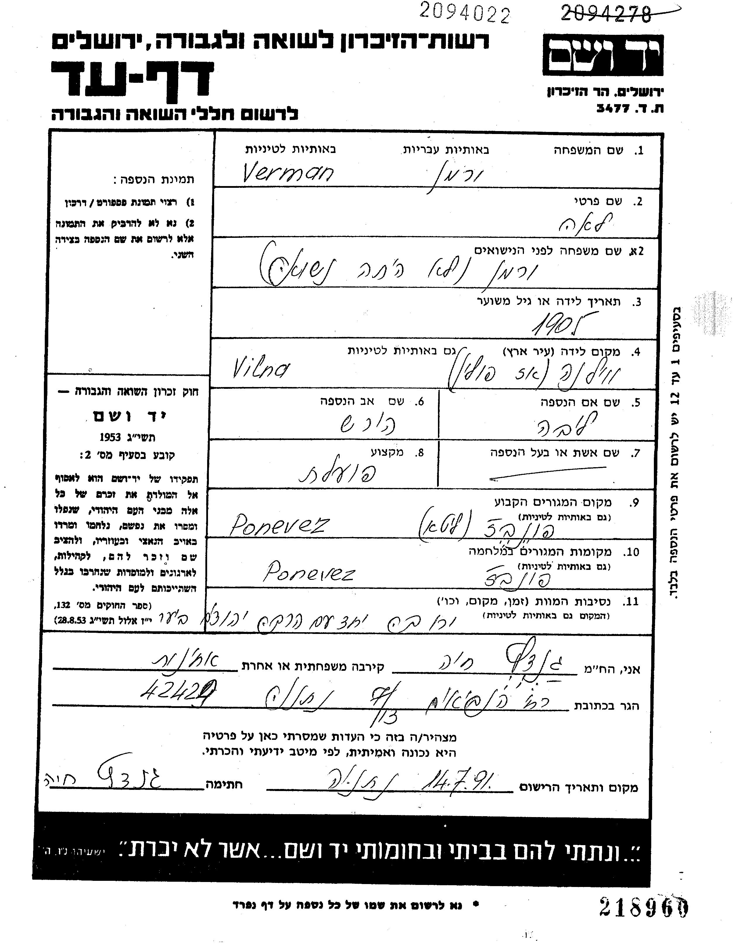 Лея Верман, место рождения: Вильно, Польша. Отец: Хирш, mать:Либа. Рабочий / рабочая. Холост / не замужем. Место жительства до войны: Поневеж, Литва. Место во время войны: Поневеж, Литва.